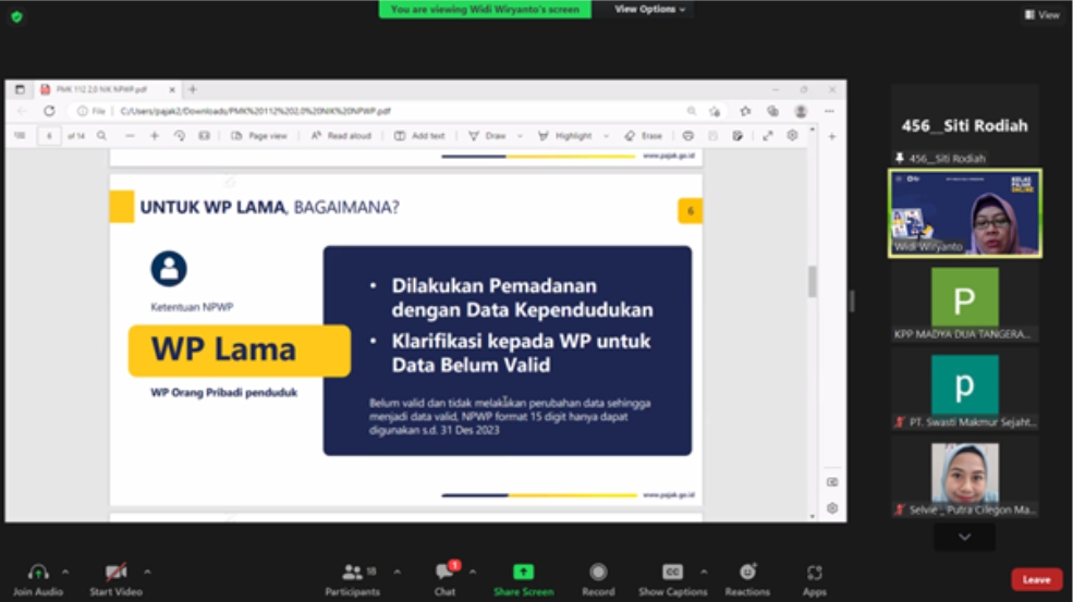Kelas Pajak yang dipandu oleh Siti Rodiah dan tim penyuluh KPP Madya Dua Tangerang ini berlangsung selama dua jam dan dihadiri oleh 18 peserta. “Untuk NPWP dengan format lama tenang saja, masih dapat digunakan hingga 31 Desember 2023,” tutur Siti Rodiah.