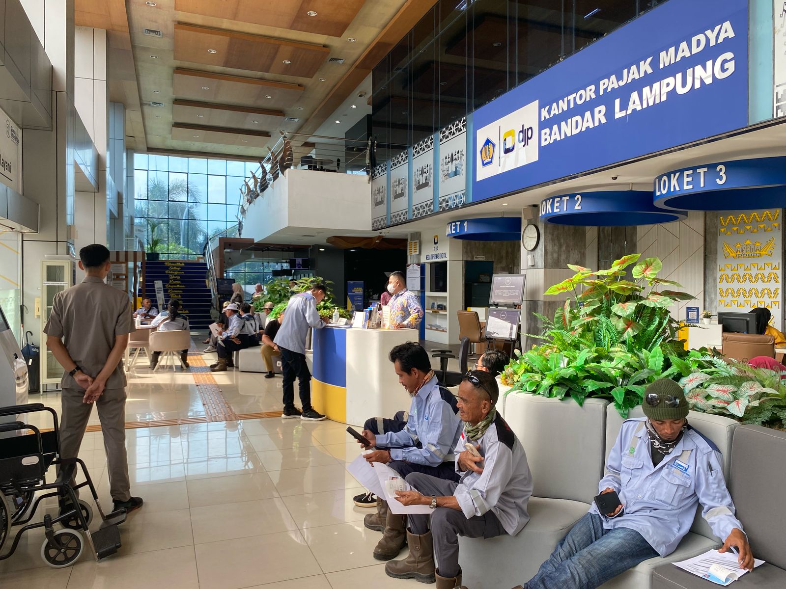 Wajib pajak ramai memadati Kantor Pelayanan Pajak (KPP) Madya Bandar Lampung di Jalan Pangeran Emir M. Noer Nomor 5A, Sumur Putri, Teluk Betung Utara (Jumat, 11/4). Sejak pagi, antrean panjang terlihat di area Tempat Pelayanan Terpadu (TPT) pelayanan dengan jumlah nomor antrean yang meningkat di hari terakhir pelaporan SPT Tahunan Wajib Pajak Orang Pribadi.
