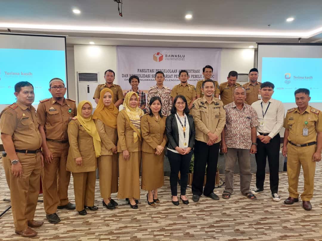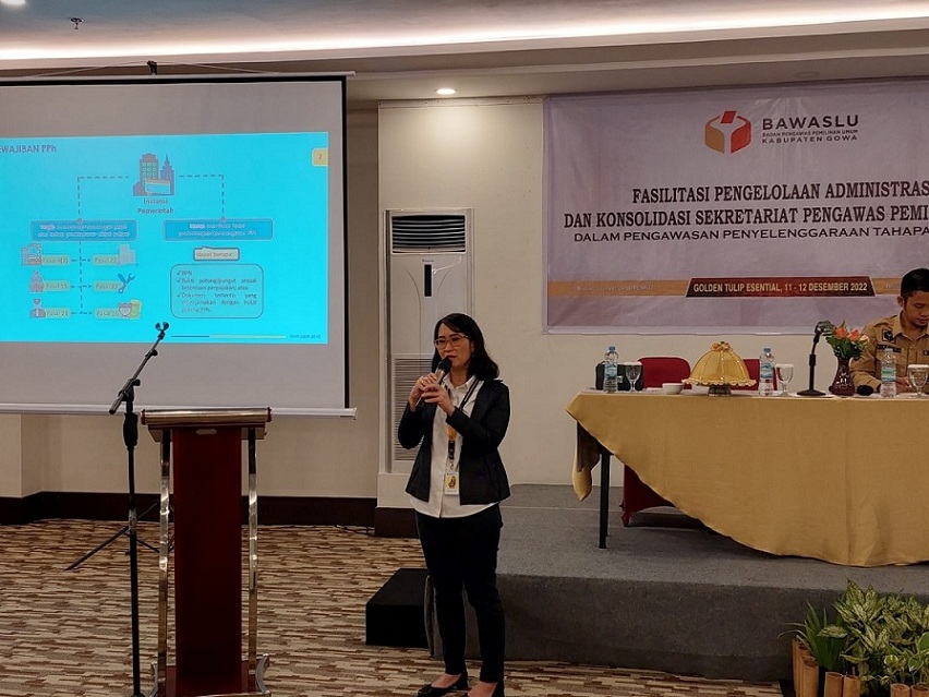 Plh Kepala Kantor Pelayanan, Penyuluhan, dan Konsultasi Perpajakan (KP2KP) Sungguminasa Creschenthum Srimariastuti Boroh, bersama seorang Asisten Penyuluh Pajak Kantor Pelayanan Pajak (KPP) Pratama Bantaeng Muh. Idham Halid, menjadi narasumber dalam kegiatan Fasilitasi Pengelolaan Administrasi dan Konsolidasi Sekretariat Pengawas Pemilu Ad-hoc dalam Pengawasan Penyelenggaraan Tahapan Pemilu di Kabupaten Gowa, Sulawesi Selatan (Senin, 12/12).