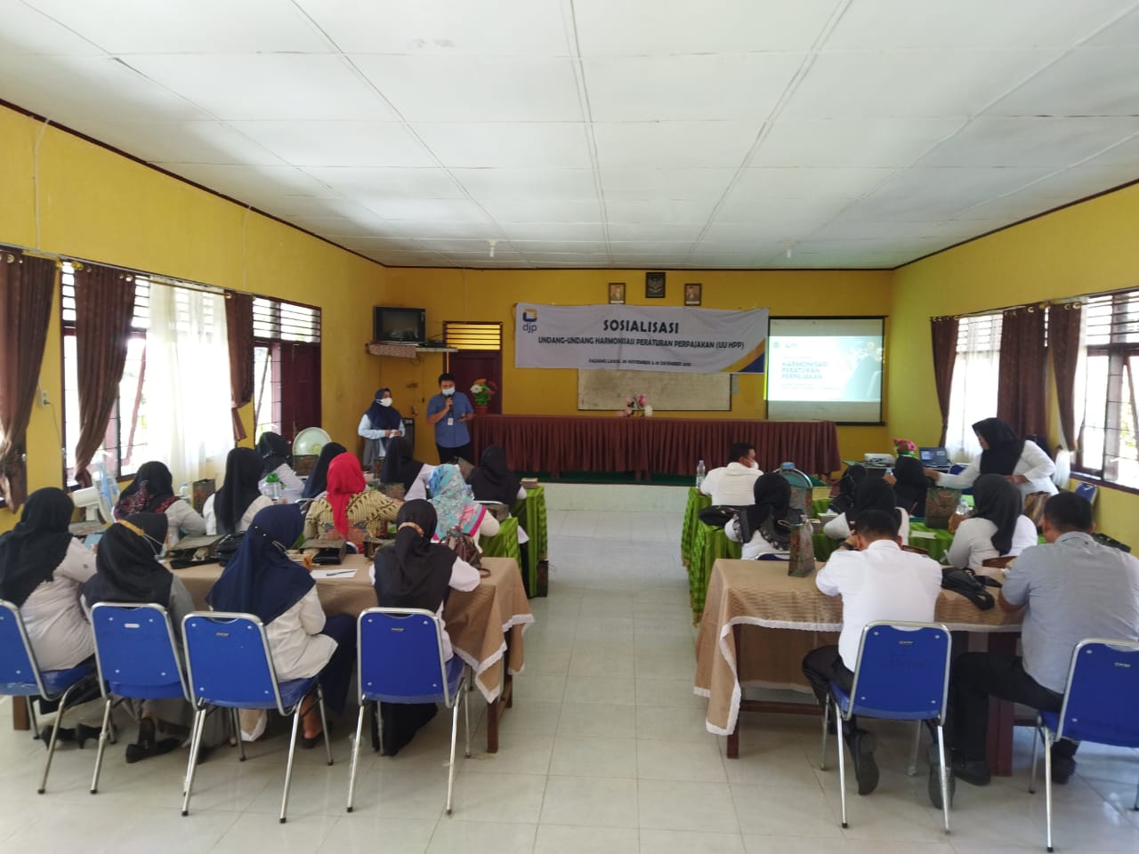 Kantor Pelayanan Pajak (KPP) Pratama Padang Sidempuan dan Kantor Pelayanan, Penyuluhan, dan Konsultasi Perpajakan (KP2KP) Sibuhuan melaksanakan Sosialisasi Undang-Undang Nomor 7 Tahun 2021 tentang Harmonisasi Peraturan Perpajakan (UU HPP) kepada para guru SMA Negeri 1 Sosa di Aula SMA Negeri 1 Sosa, Kabupaten Padang Lawas, Sumatera Utara (Rabu, 1/12). Tim gabungan tersebut terdiri dari Fungsional Penyuluh dan Pelaksana dari KPP Pratama Padang Sidempuan dan KP2KP Sibuhuan.