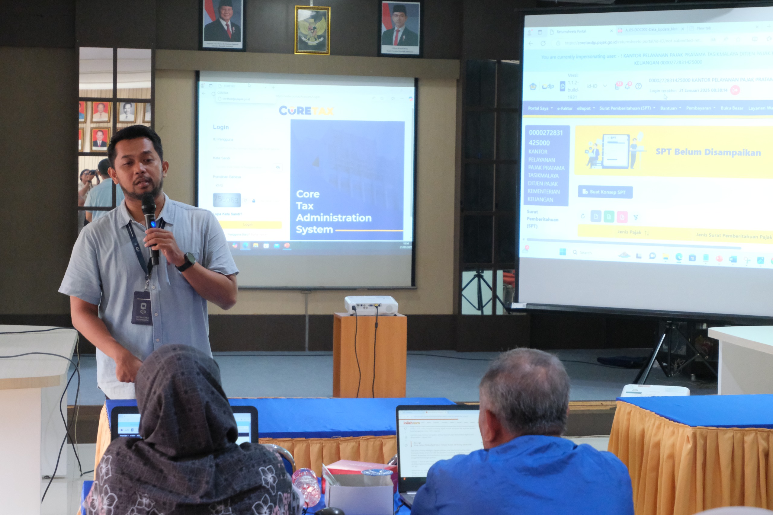 Kantor Pelayanan Pajak (KPP) Pratama Tasikmalaya mengadakan sosialisasi Pembuatan e-Bupot dan Surat Pemberitahuan (SPT) Unifikasi melalui aplikasi Coretax DJp kepada unit vertikal instansi pemerintah di wilayah Kota dan Kabupaten Tasikmalaya di Aula KPP Pratama Tasikmalaya, Kota Tasikmalaya (Selasa, 21/1).