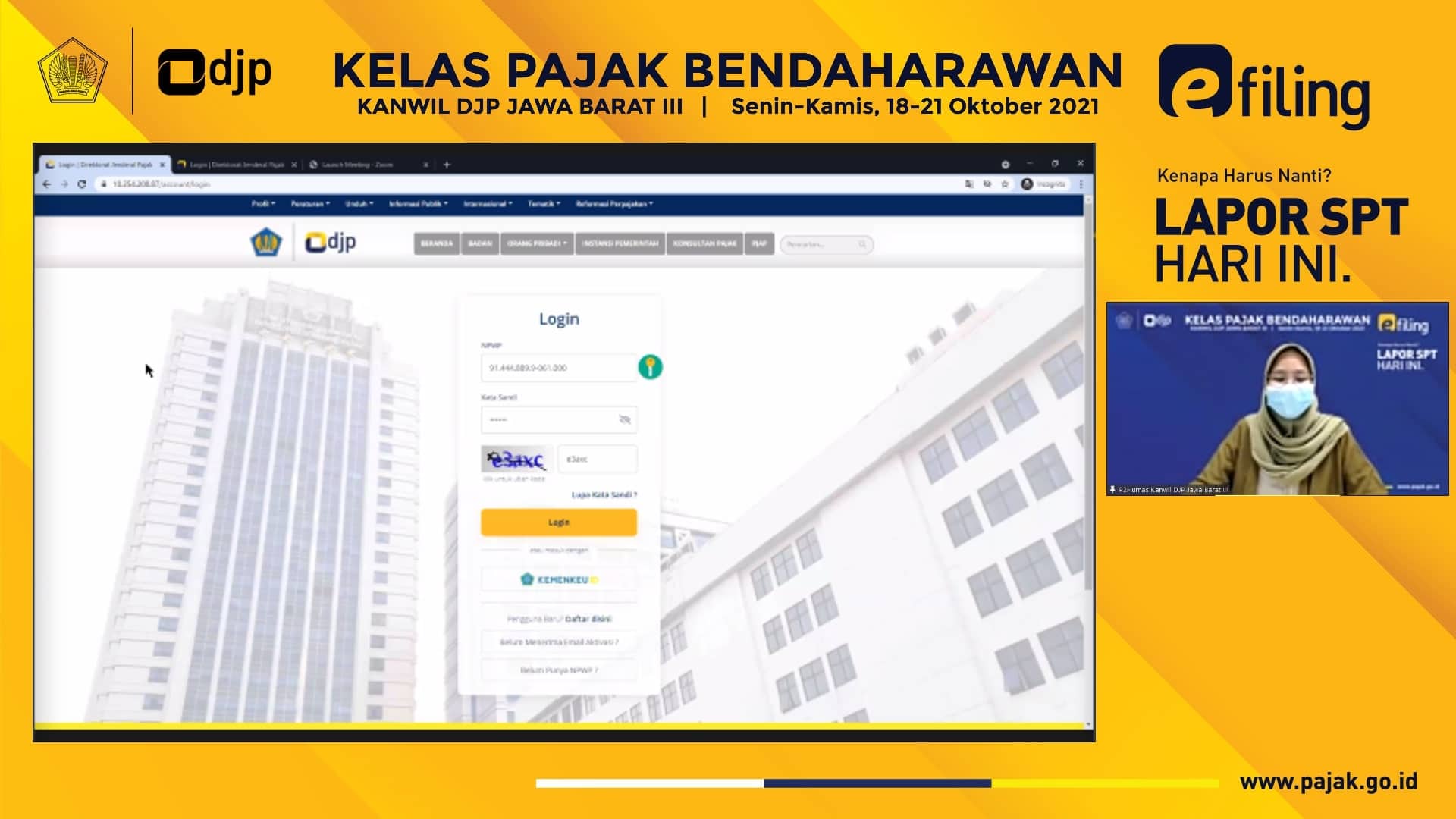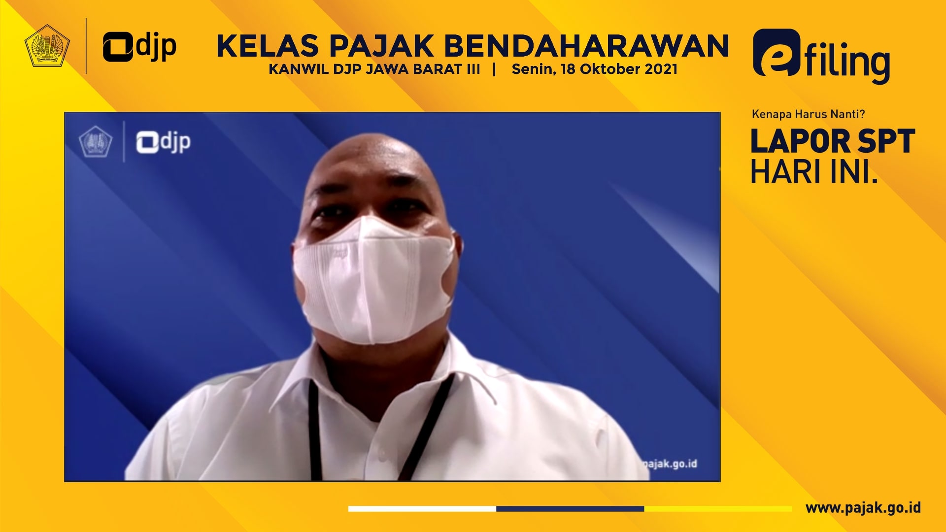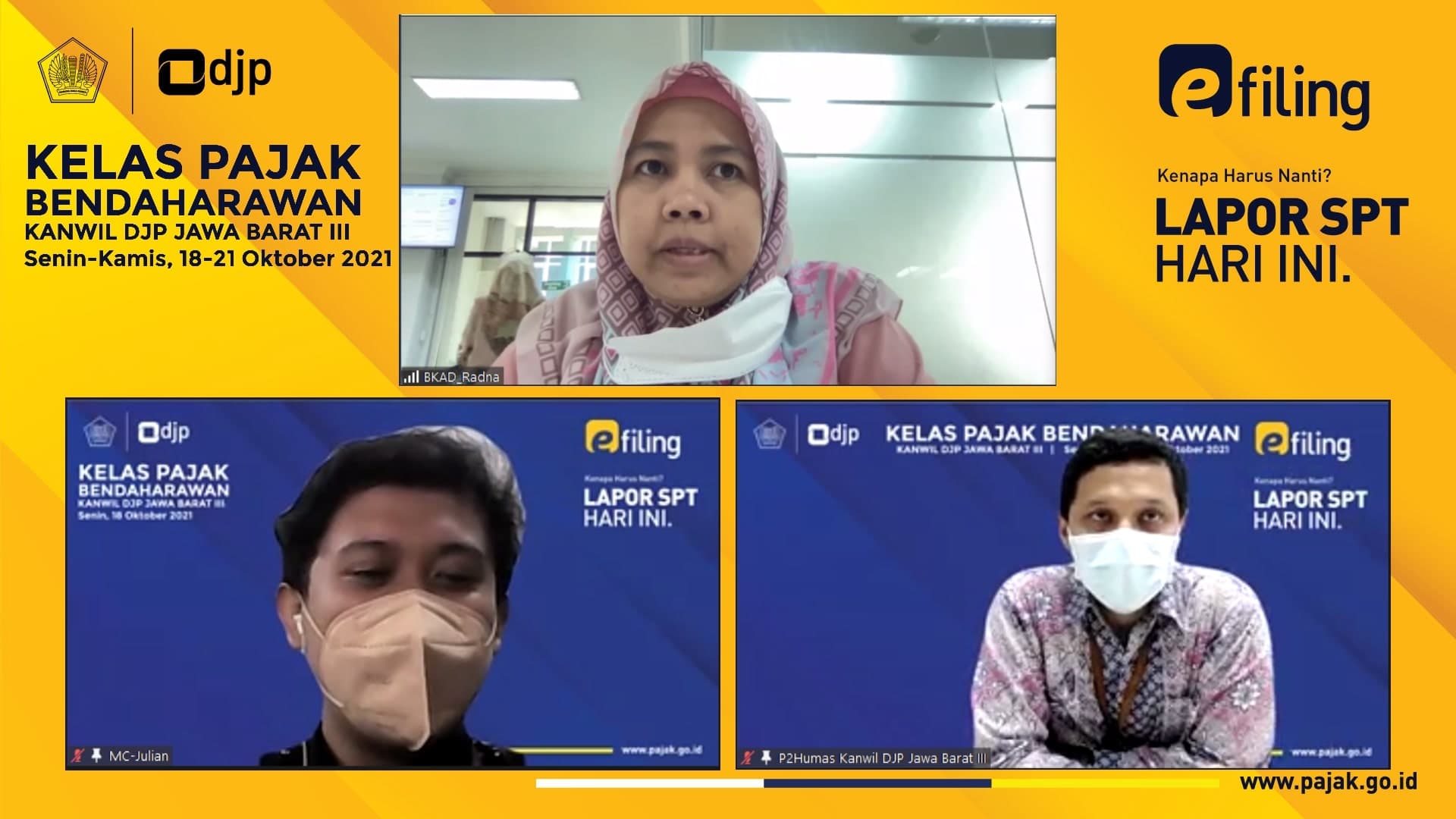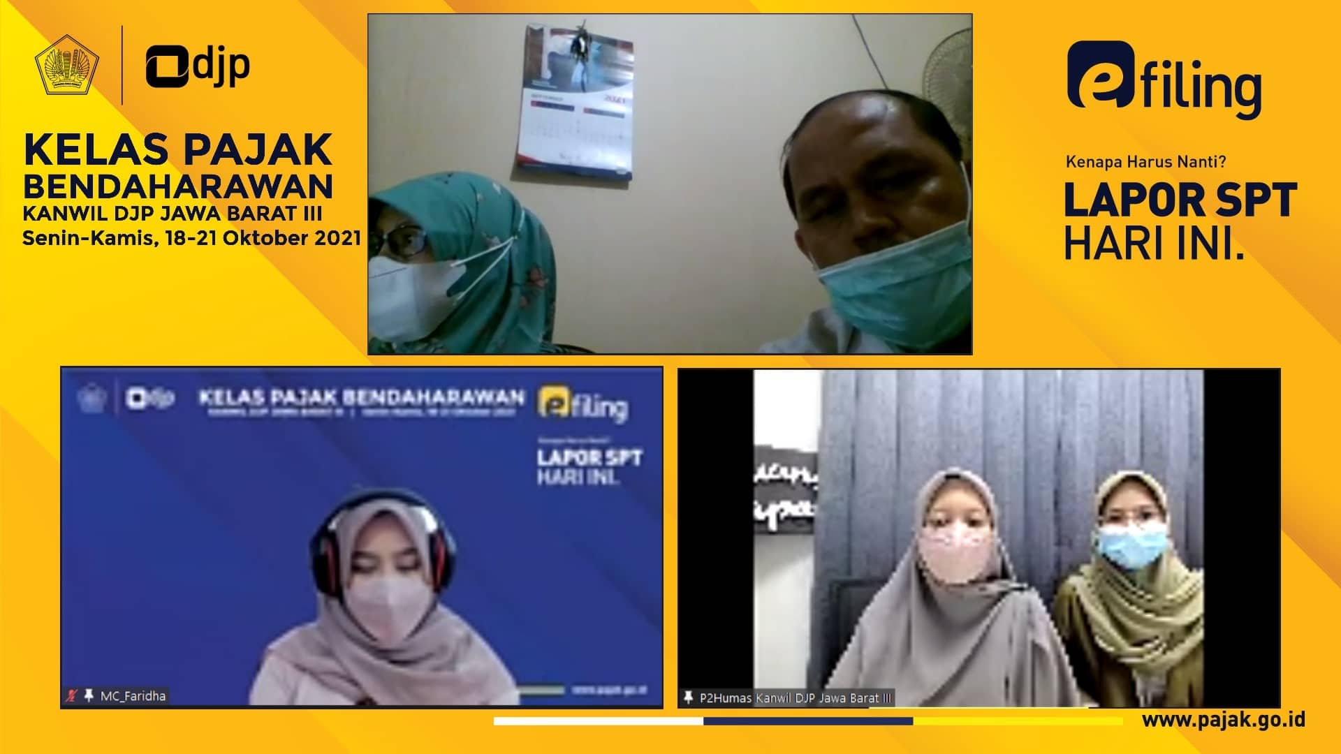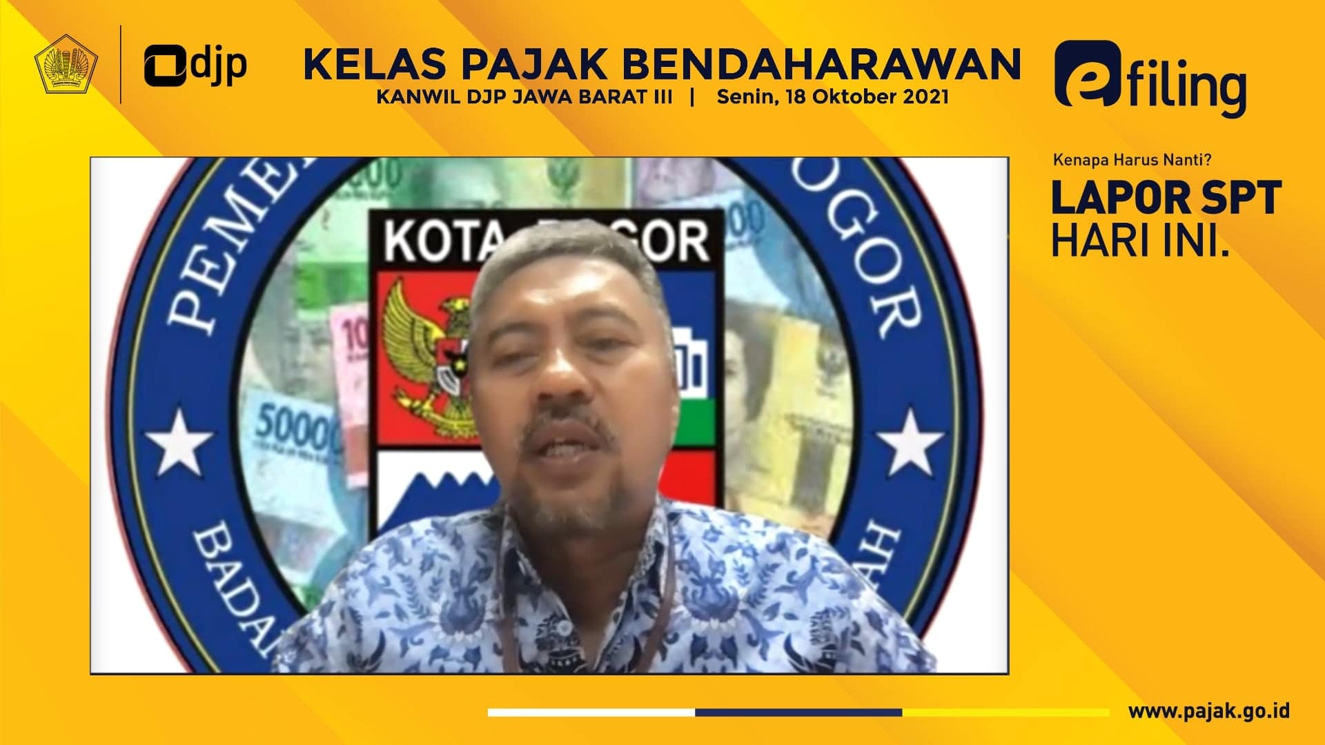 Kantor Wilayah Direktorat Jenderal Pajak (DJP) Jawa Barat III bekerja sama dengan Kantor Pelayanan Perpajakan (KPP) Pratama Bogor menggelar Edukasi Perpajakan Bendahara Satuan Kerja di Lingkungan Pemerintahan Kota Bogor. Edukasi perpajakan yang dikemas dalam kelas pajak ini dilaksanakan secara daring, Kota Bogor (Kamis, 21/10).
