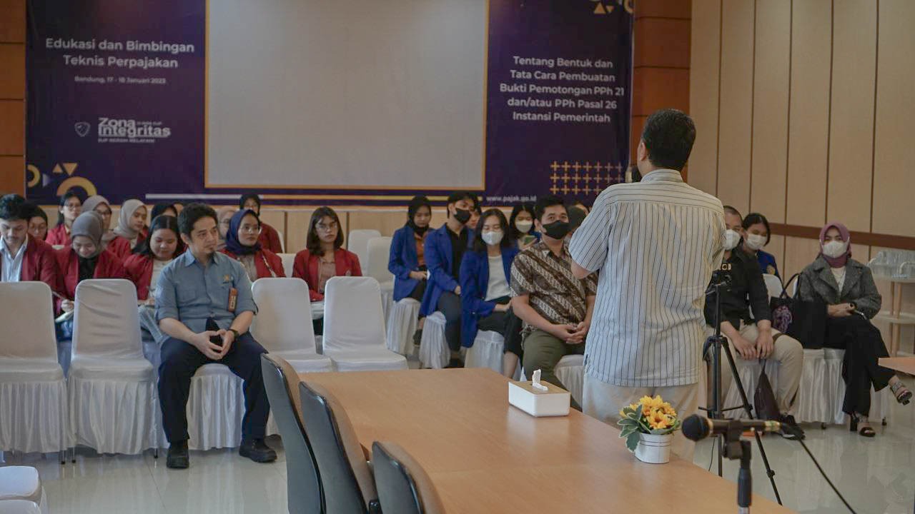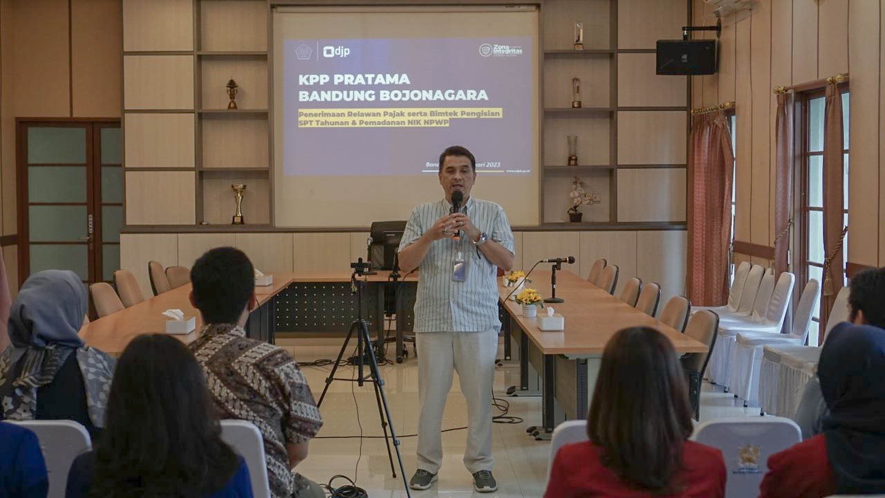 Kantor Pelayanan Pajak (KPP) Pratama Bandung Bojonagara memberikan pembekalan kepada 40 relawan pajak secara luring di Aula KPP Pratama Bandung Bojonagara, Jalan Terusan Prof. Dr. Sutami nomor 2, Kota Bandung  (Kamis, 23/2). Kegiatan ini dilaksanakan untuk menyiapkan  relawan pajak dalam tugas asistensi penyampaian Surat Pemberitahuan (SPT) Tahunan melalui e-Filing serta menyukseskan Pemadanan NIK- NPWP.