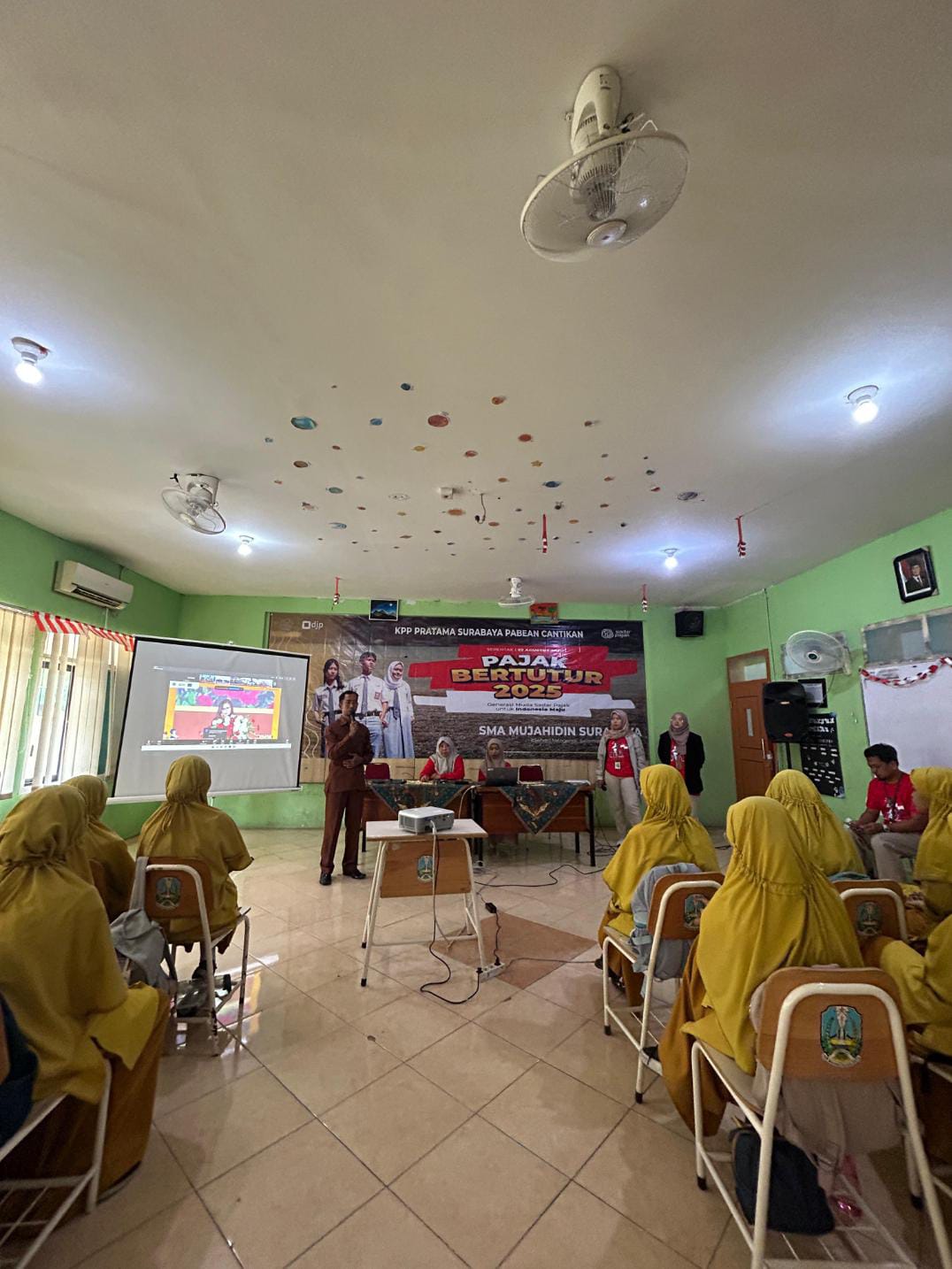 Dalam Pajak Bertutur 2025, KPP Pratama Surabaya Pabean Cantikan secara langsung tatap muka dan dipandu oleh kakak-kakak Penyuluh Pajak di Aula Lantai 2 SMA Mujahidin Surabaya dan diikuti oleh 80 siswa putri dari kelas XI dan XII baik dari jurusan IPA maupun IPS.