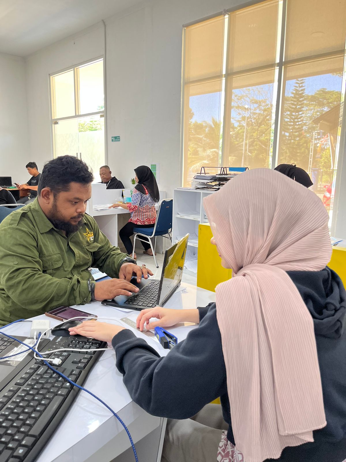 Direktur Samudra Alam Morowali (SAM), Nursam, mendatangi Loket Help Desk Kantor Pelayanan Pajak (KPP) Pratama Poso, Sulawesi Tengah (Jumat, 26/4). Kedatangan direktur tersebut untuk bertanya cara memasang aplikasi e-Faktur pada laptop perusahaan yang sudah berganti. Kedatangan Nursam disambut baik oleh Petugas Help Desk Nabella Putri Lestari. Nursam menjelaskan bahwa perusahaannya bergerak di bidang Penyediaan Tenaga Kerja Waktu Tertentu yang baru saja dikukuhkan sebagai Pengusaha Kena Pajak (PKP) pada awal tahun.