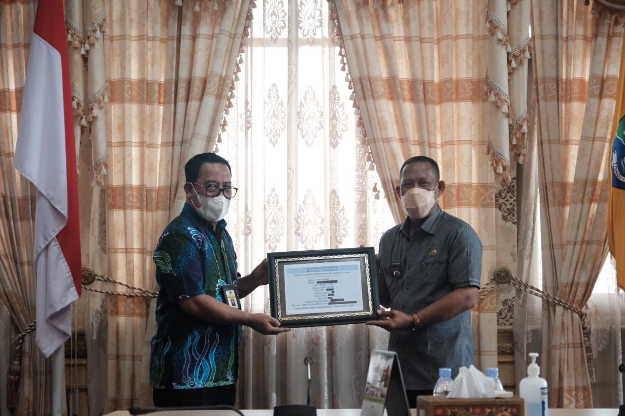 Kepala Kantor Pelayanan Pajak Pratama Tanjung Redeb Mu’alif didampingi oleh Kepala Kantor Pelayanan Penyuluhan dan Konsultasi Perpajakan (KP2KP) Tanjung Selor Agus Setiawan memberikan penghargaan kepada Bupati Bulungan Syarwani sebagai wujud apresiasi atas kerja sama dan sinergi yang baik antara Pemerintah Daerah Kabupaten Bulungan dan Kementerian Keuangan khususnya Direktorat Jenderal Pajak di Ruang kerja Bupati Bulungan (Jumat, 1/4).