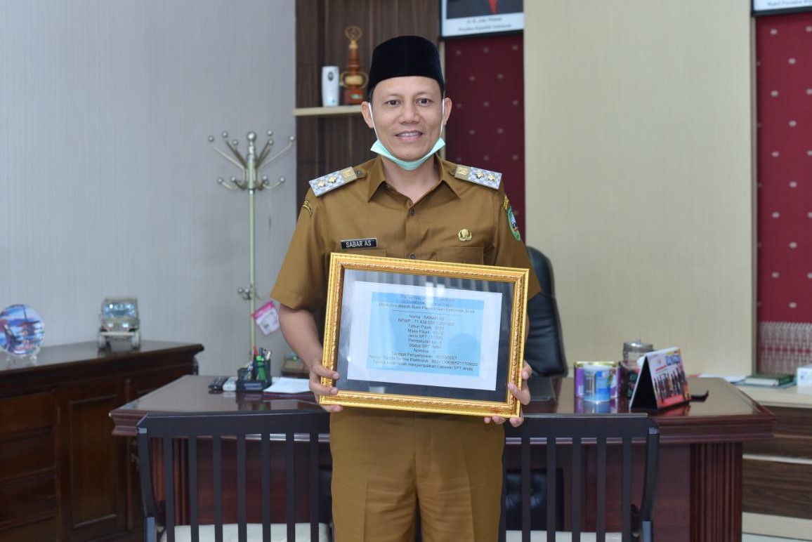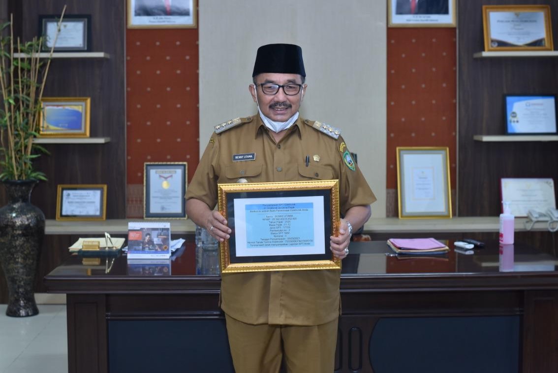 Bupati Pasaman Benny Utama dan Wakil Bupati Pasaman Sabar A S melaporkan SPT Tahunan secara e-Filing dengan didampingi oleh Kepala Kantor Pelayanan Pajak (KPP) Pratama Bukittinggi Akhirruddin dan Kepala Kantor Pelayanan, Penyuluhan, dan Konsultasi Perpajakan (KP2KP) Lubuk Sikaping Gusfahmi Arifin di Kabupaten Pasaman, Sumatra Barat (Selasa, 9/3).