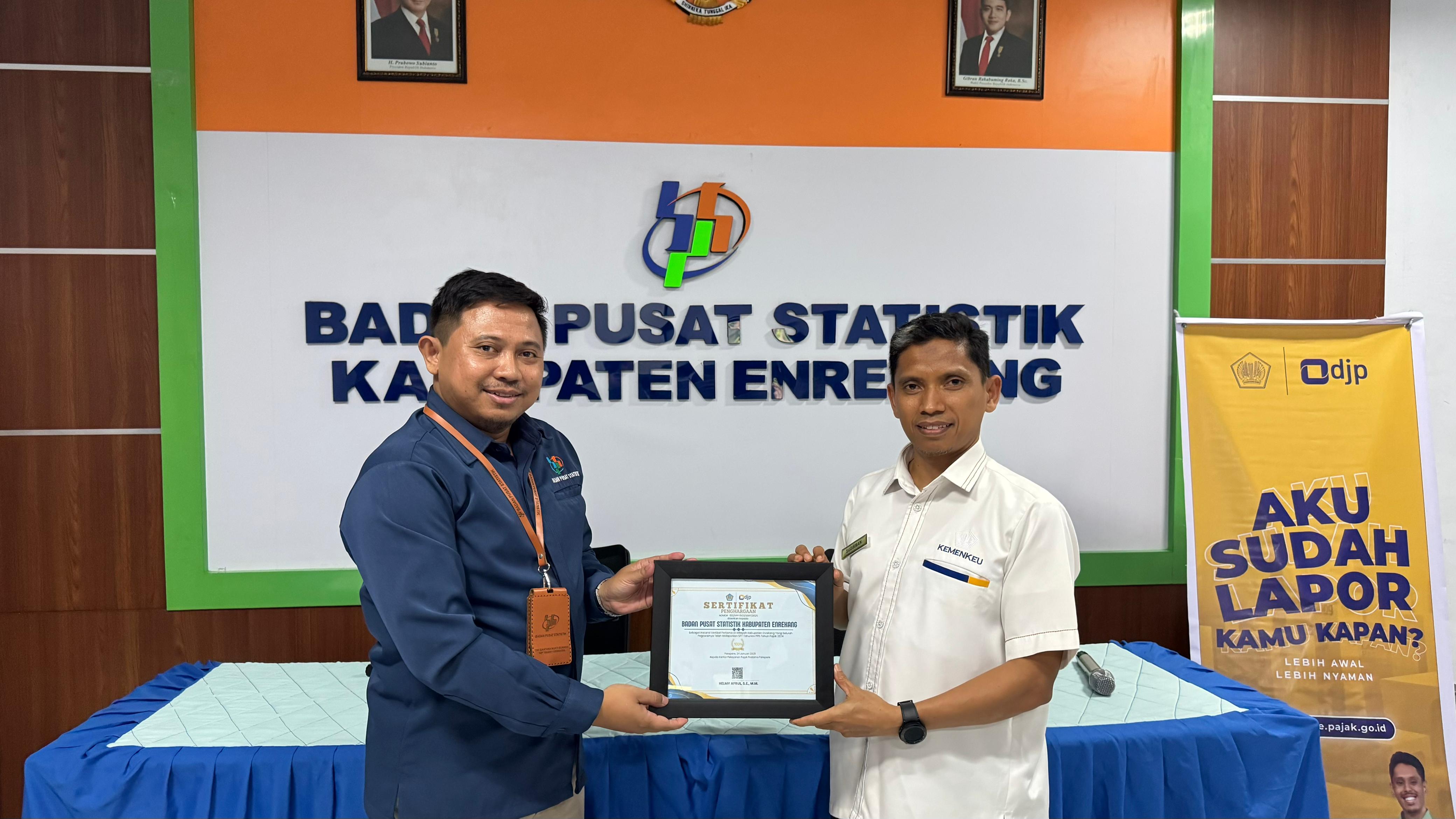 Kantor Pelayanan, Penyuluhan, dan Konsultasi Perpajakan (KP2KP) Enrekang memberikan penghargaan kepada Badan Pusat Statistik (BPS) Kabupaten Enrekang atas pencapaiannya sebagai lembaga pertama di Kabupaten Enrekang dengan tingkat kepatuhan 100% dalam pelaporan Surat Pemberitahuan (SPT) Tahunan (Senin, 3/2). Acara ini berlangsung di Kantor BPS Kabupaten Enrekang yang beralamat di Jalan Sultan Hasanuddin Poros Enrekang-Toraja Km 3, Kabupaten Enrekang, Sulawesi Selatan.