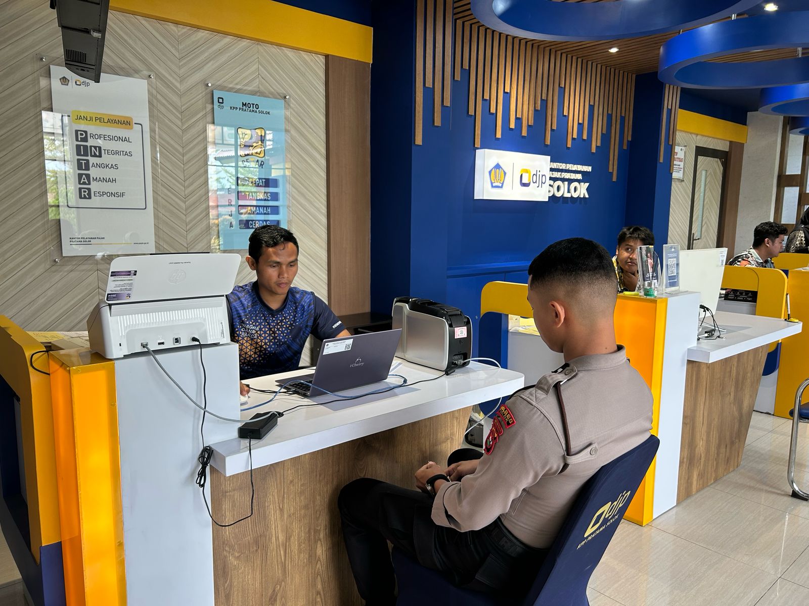 Sejumlah anggota Kepolisian Resor (Polres) Solok Kota mendatangi Kantor Pelayanan Pajak (KPP) Pratama Solok untuk mendapatkan asistensi dalam pelaporan SPT Tahunan Tahun 2024 di Kota Solok (Jumat, 21/2). Kedatangan mereka bertujuan untuk memastikan kewajiban perpajakan sebagai anggota Polri terpenuhi sebelum batas akhir pelaporan pada bulan Maret ini.
