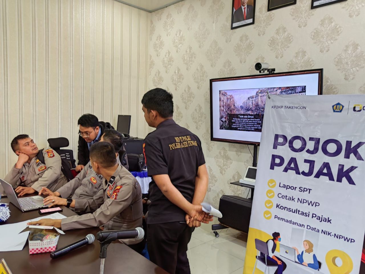 Kegiatan pojok pajak kali ini disambut antusias oleh jajaran pegawai/anggota Polri di lingkungan Polres Aceh Tengah. Kegiatan pojok pajak melayani pelaporan SPT Tahunan, pemadanan Nomor Induk Kependudukan (NIK) sebagai Nomor Pokok Wajib Pajak (NPWP), cetak ulang kartu NPWP, dan layanan konsultasi perpajakan lainnya.