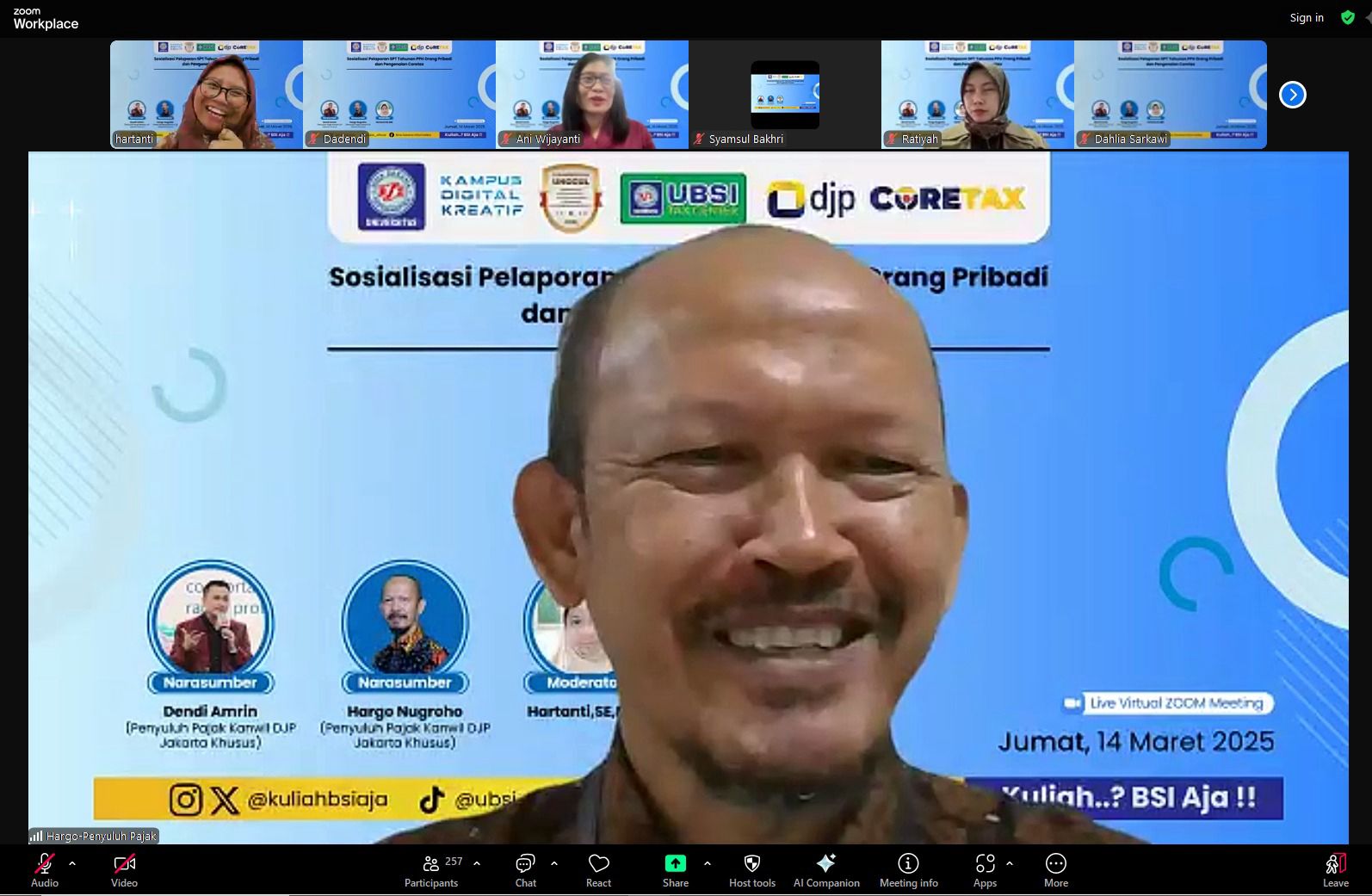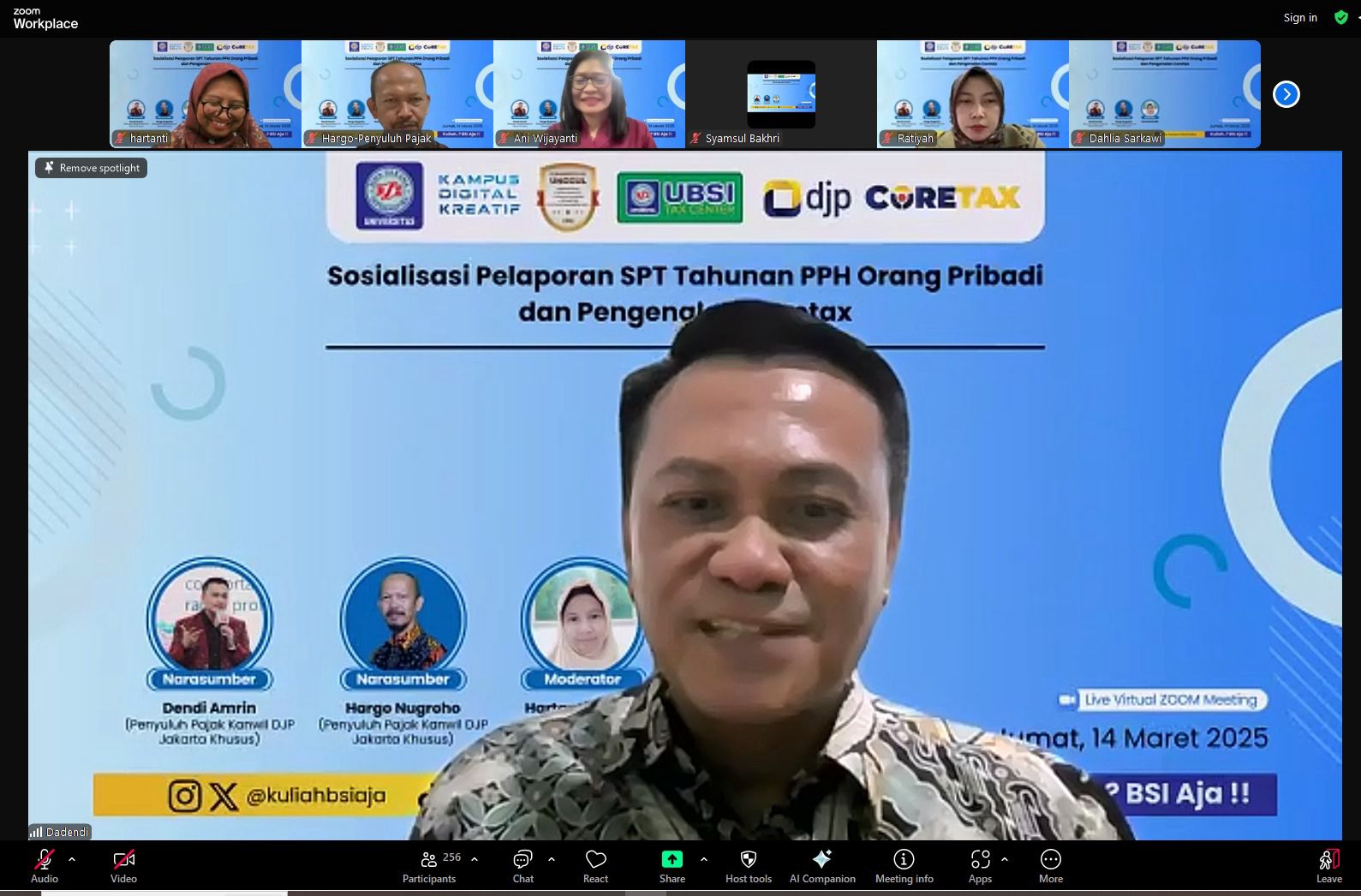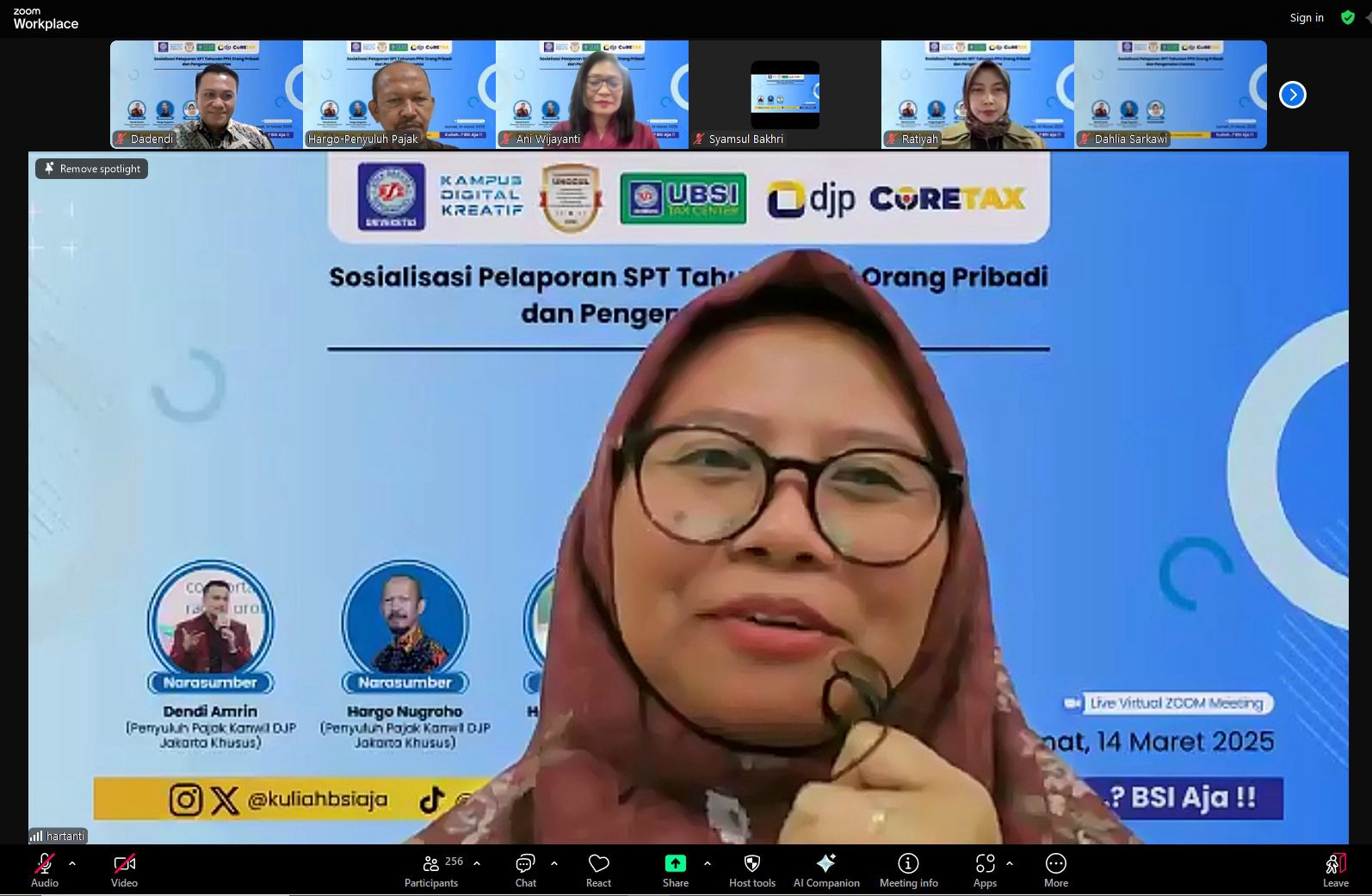 Kantor Wilayah Direktorat Jenderal Pajak (Kanwil DJP) Jakarta Khusus kembali menggelar kegiatan pendampingan pengisian Surat Pemberitahuan (SPT) Tahunan bagi sekitar 300 dosen dan staf Universitas Bina Sarana Informatika (UBSI) melalui Zoom Meeting (Jumat, 14/3). Program ini bertujuan untuk memberikan edukasi dan kemudahan dalam proses pelaporan pajak, terutama bagi wajib pajak yang masih mengalami kendala teknis atau administrasi.
