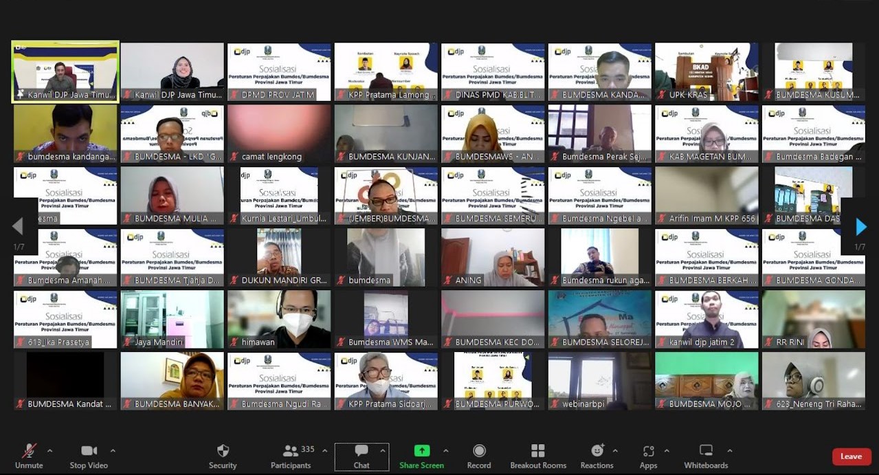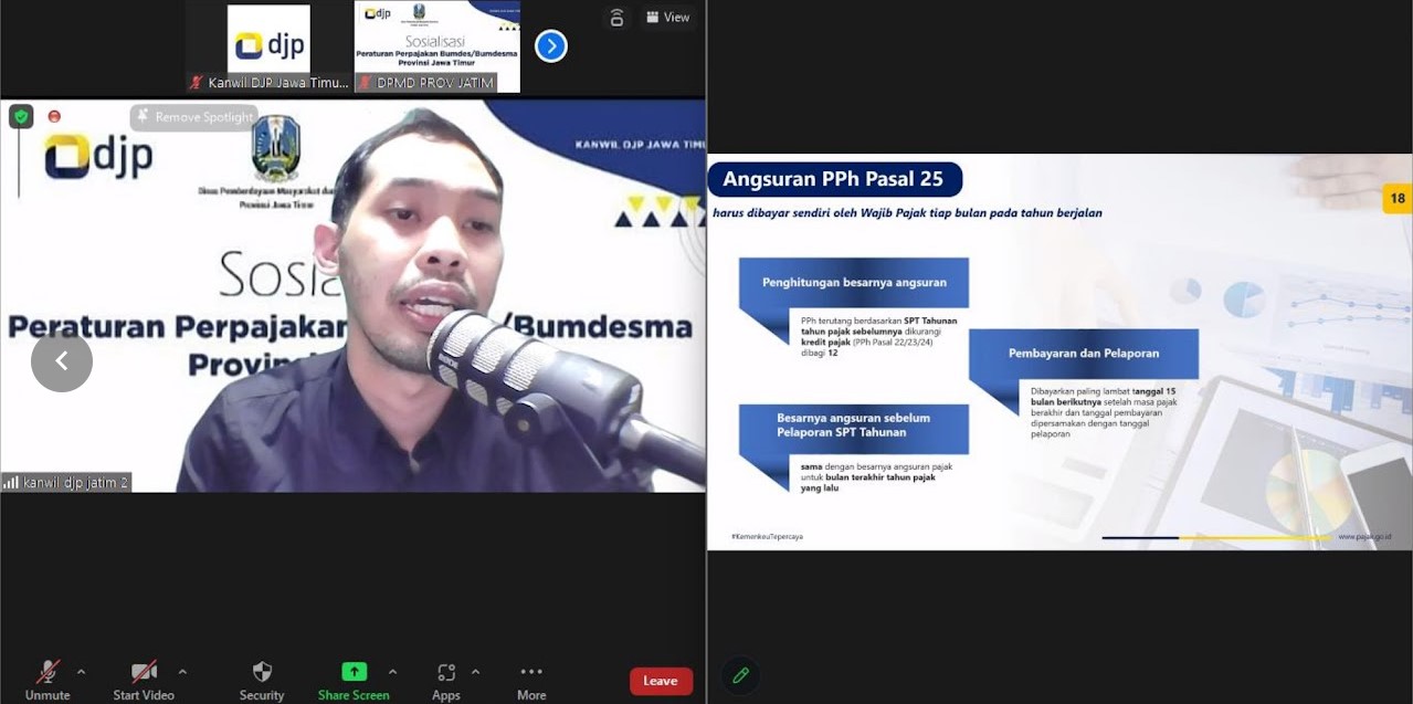Direktorat Jenderal Pajak Jawa Timur (DJP Jatim) Bersatu bekerja sama dengan Dinas Pemberdayaan Masyarakat dan Desa (PMD) Provinsi Jawa Timur dalam menyelenggarakan kegiatan sosialisasi Peraturan Pemerintah Nomor 55 Tahun 2022 tentang Penyesuaian Pengaturan di Bidang Pajak Penghasilan secara daring melalui aplikasi Zoom di Surabaya (Kamis 15/6).