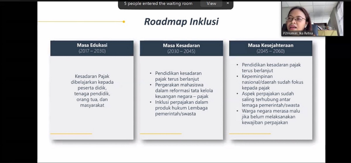 Inklusi kesadaran Pajak merupakan upaya bersama DJP dengan Kemendikbud dan Kemenriset Dikti selaku pihak yang membidangi pendidikan dan menanamkan kesadaran pajak kepada peserta didik dan tenaga pendidik melalui integrasi materi kesadaran pajak dalam pendidikan. Kegiatan diawali dengan sambutan oleh Kepala Kantor Wilayah Direktorat Jenderal Pajak Riau Farid Bachtiar dan dilanjutkan oleh Ika Retna selaku pemateri dari pihak DJP dan Benny Susanti selaku perwakilan dari Perguruan Tinggi.