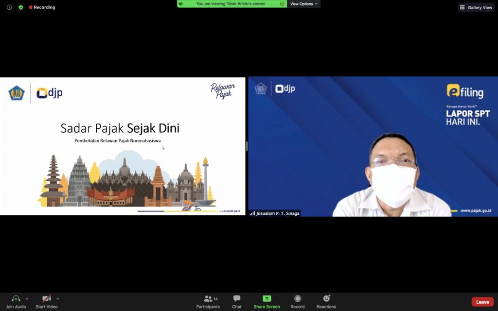 Kantor Wilayah Direktorat Jenderal Pajak (Kanwil DJP) Sumatera Utara I memberikan pembekalan kepada 21 Relawan Pajak Non Mahasiswa dari Asosiasi/Organisasi Perkumpulan (Kamis, 18/3). Pembekalan ini dilakukan secara daring melalui aplikasi zoom di ruang rapat Kanwil DJP Sumatera Utara I, Medan.