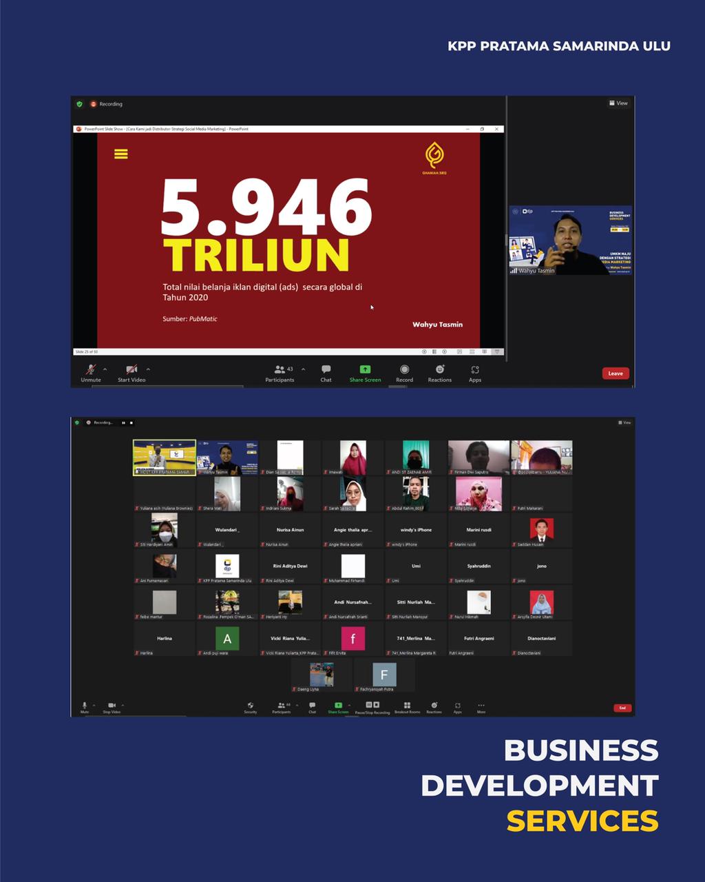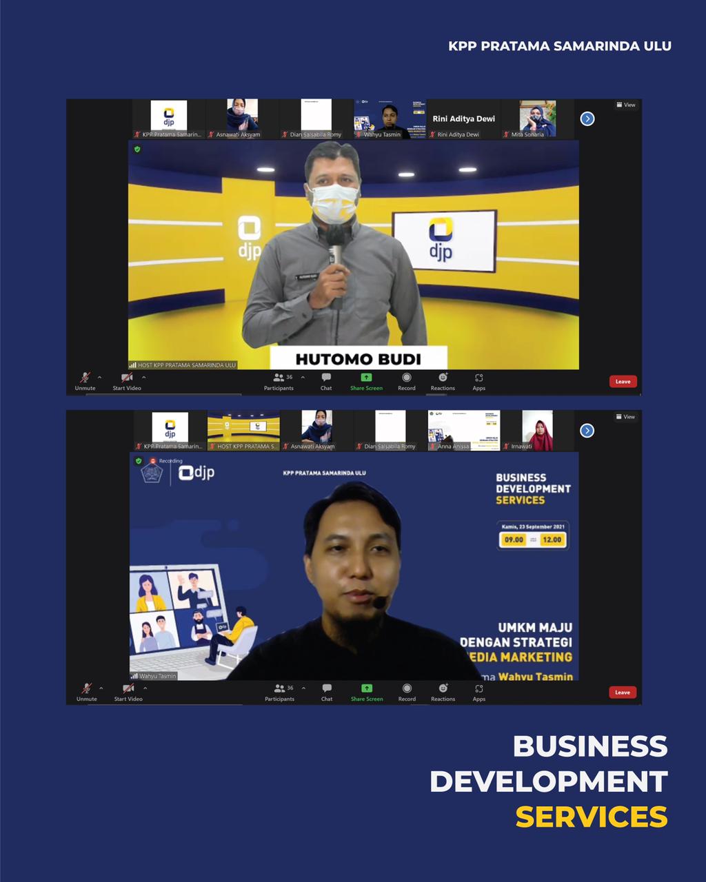 Kantor Pelayanan Pajak (KPP) Pratama Samarinda Ulu menyelenggarakan kegiatan Business Development Service dengan tema “UMKM Maju dengan Strategi Social Media Marketing” melalui Zoom Meeting di Samarinda (Kamis, 23/9). Kegiatan ini diikuti oleh lebih dari 30 Wajib Pajak UMKM di Kota Samarinda dan sekitarnya.