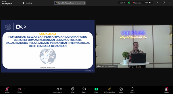 Kantor Wilayah Direktorat Jenderal Pajak (Kanwil DJP) Jawa Timur I bersama seluruh Kantor Pelayanan Pajak (KPP) di Kota Surabaya menyelenggarakan Edukasi Automatic Exchange of Information (AEoI) kepada Lembaga Jasa Keuangan (LJK), LJK Lainnya, dan Entitas Lainnya di Kota Surabaya (Selasa, 29/4).
