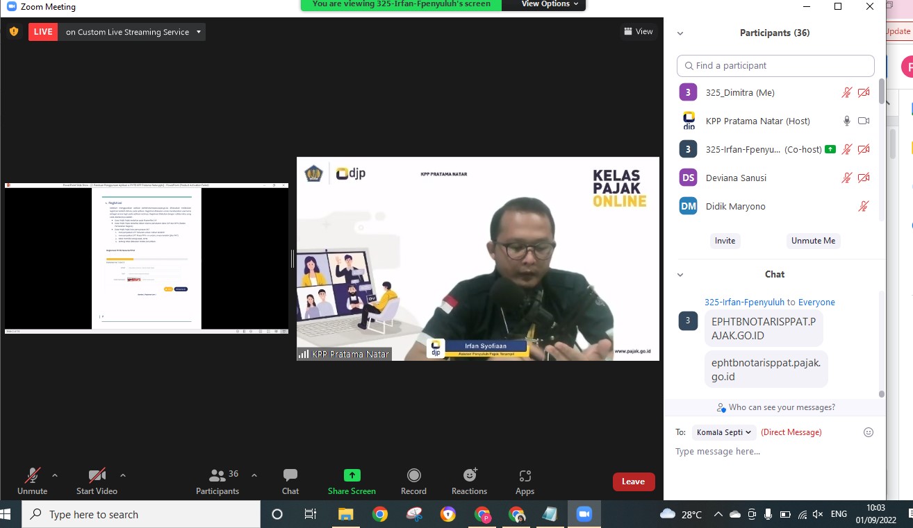 Kantor Pelayanan Pajak (KPP) Pratama Natar mengundang para Notaris/ Pejabat Pembuat Akta Tanah (PPAT) yang berasal dari wilayah Pesawaran, Pringsewu, dan Tanggamus untuk mengikuti kelas pajak secara daring mengenai panduan penggunaan aplikasi e-PHTB di Ruang Penyuluhan KPP Natar, Lampung Selatan (Kamis, 1/9).