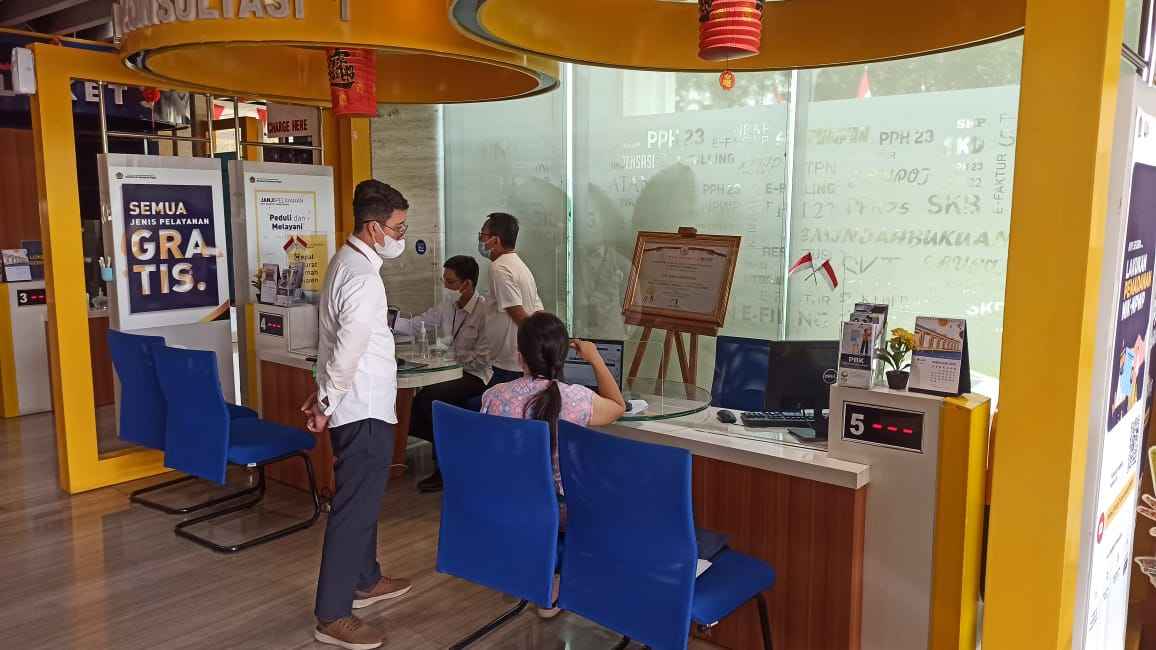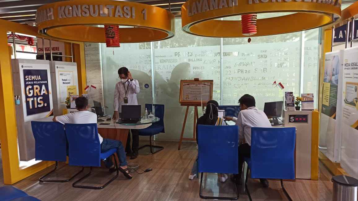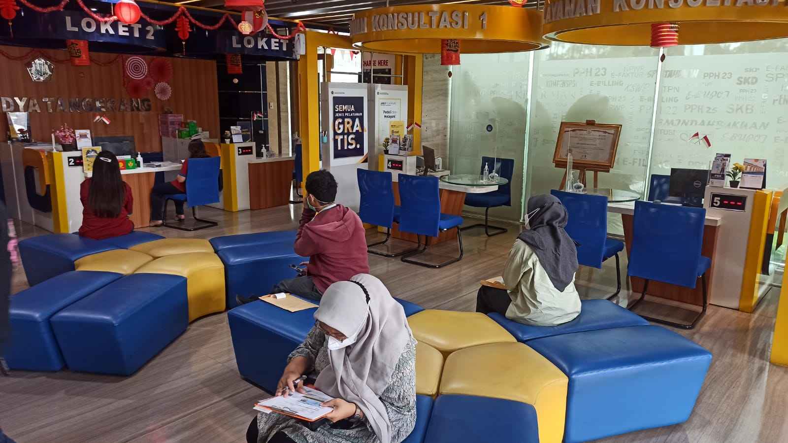 Pegawai Kantor Pelayanan Pajak (KPP) Madya Tangerang memandu wajib pajak untuk memenuhi kewajiban pelaporan Surat Pemberitahuan (SPT) Tahunan di Loket Layanan Mandiri pelaporan SPT Tahunan KPP Madya Tangerang, Kota Tangerang (Senin, 6/3).