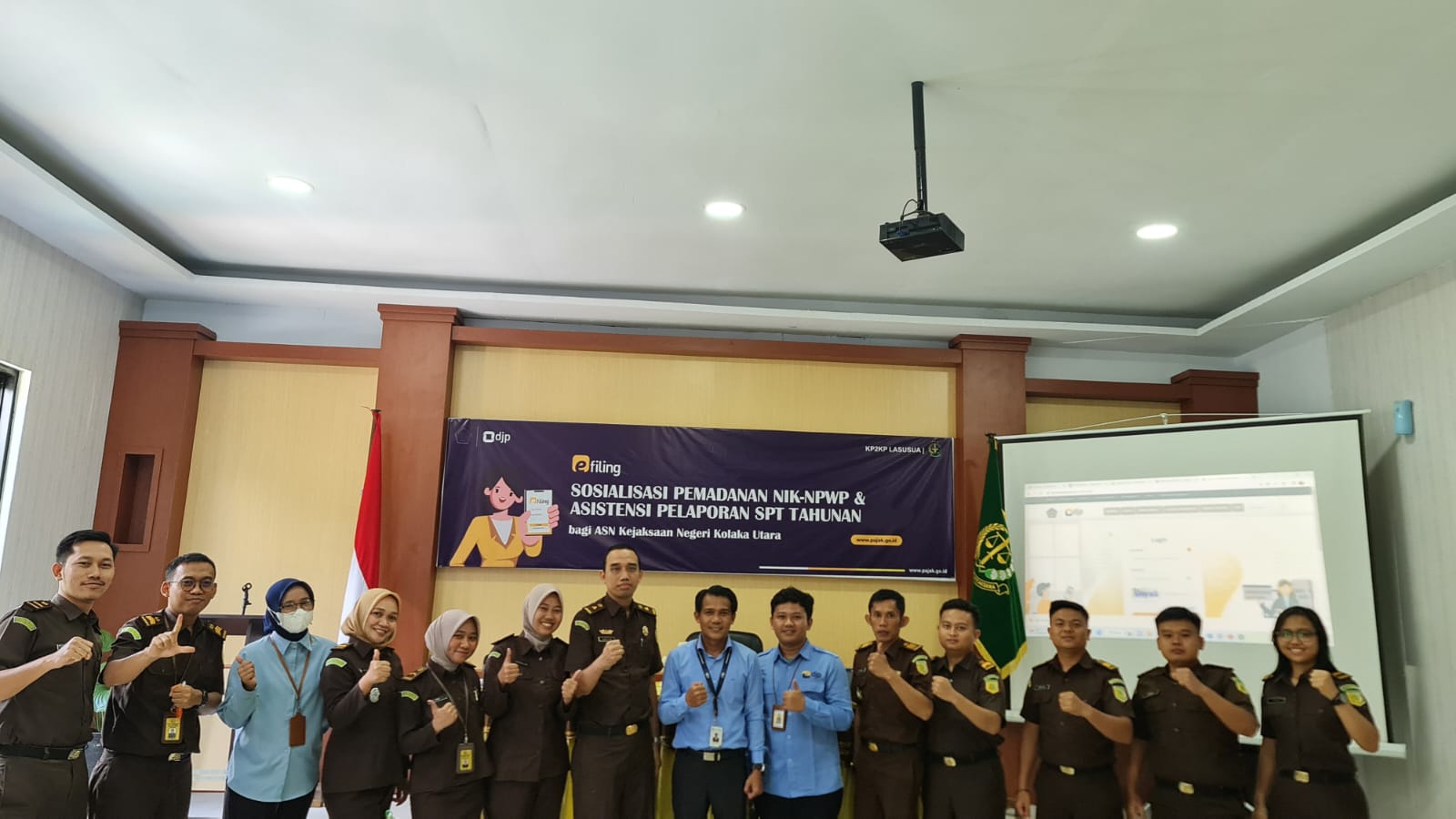Kantor Pelayanan, Penyuluhan, dan Konsultasi Perpajakan (KP2KP) Lasusua mengadakan sosialisasi Pemadanan Nomor Induk Kependudukan (NIK) menjadi Nomor Pokok Wajib Pajak (NPWP) dan Asistensi Pelaporan SPT Tahunan di Aula Kejaksaan Negeri (Kejari) Kolaka Utara, Kabupaten Kolaka Utara (Rabu, 15/3). Kegiatan ini dihadiri oleh ASN dan Pegawai Pemerintah Non Pegawai Negeri (PPNPN) Kejari Kabupaten Kolaka Utara.