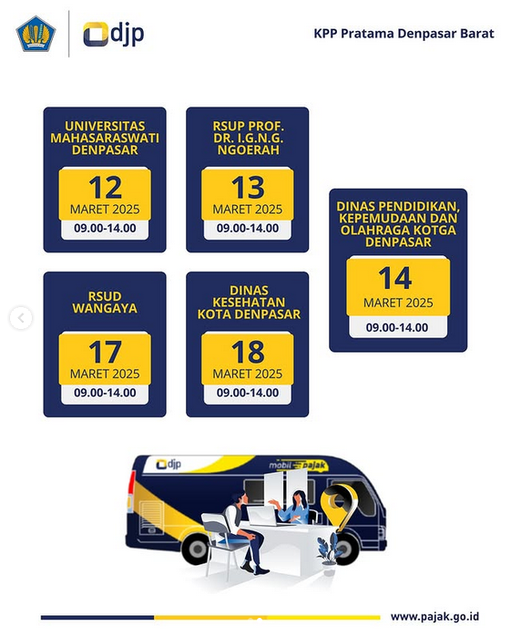 “Kantor Pelayanan Pajak (KPP) Pratama Denpasar Barat kembali menggelar Pojok Pajak di 5 lokasi berbeda. Dimulai hari ini di Universitas Mahasaraswati Denpasar, RSUP Prof. Dr. I.G.N.G Ngoerah, Dinas Pendidikan, Kepemudaan, dan Olah Raga Kota Denpasar, RSUD Wangaya, dan terakhir nanti tanggal 18 Maret 2025 di Dinas Kesehatan Kota Denpasar,” ungkap Kepala Seksi Pelayanan Luh Putu Ika Aryaningsih di Denpasar (Rabu, 12/3).