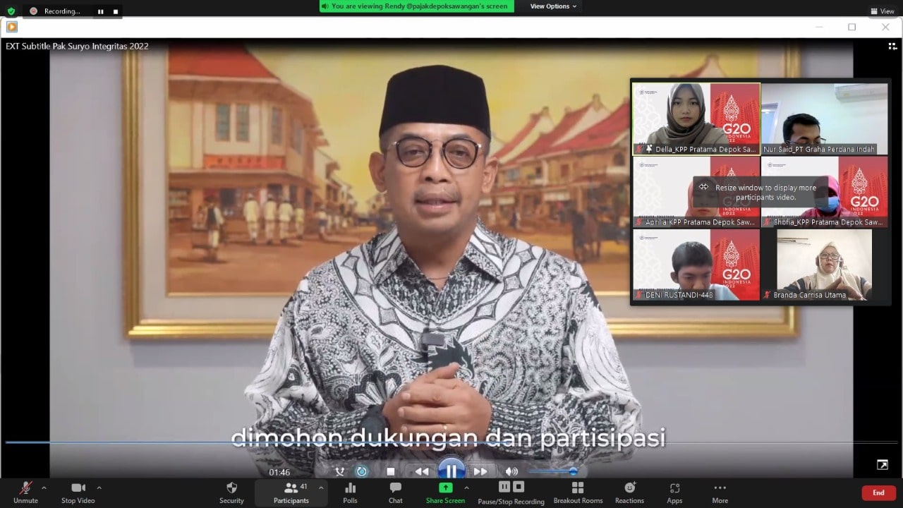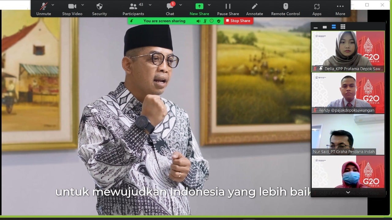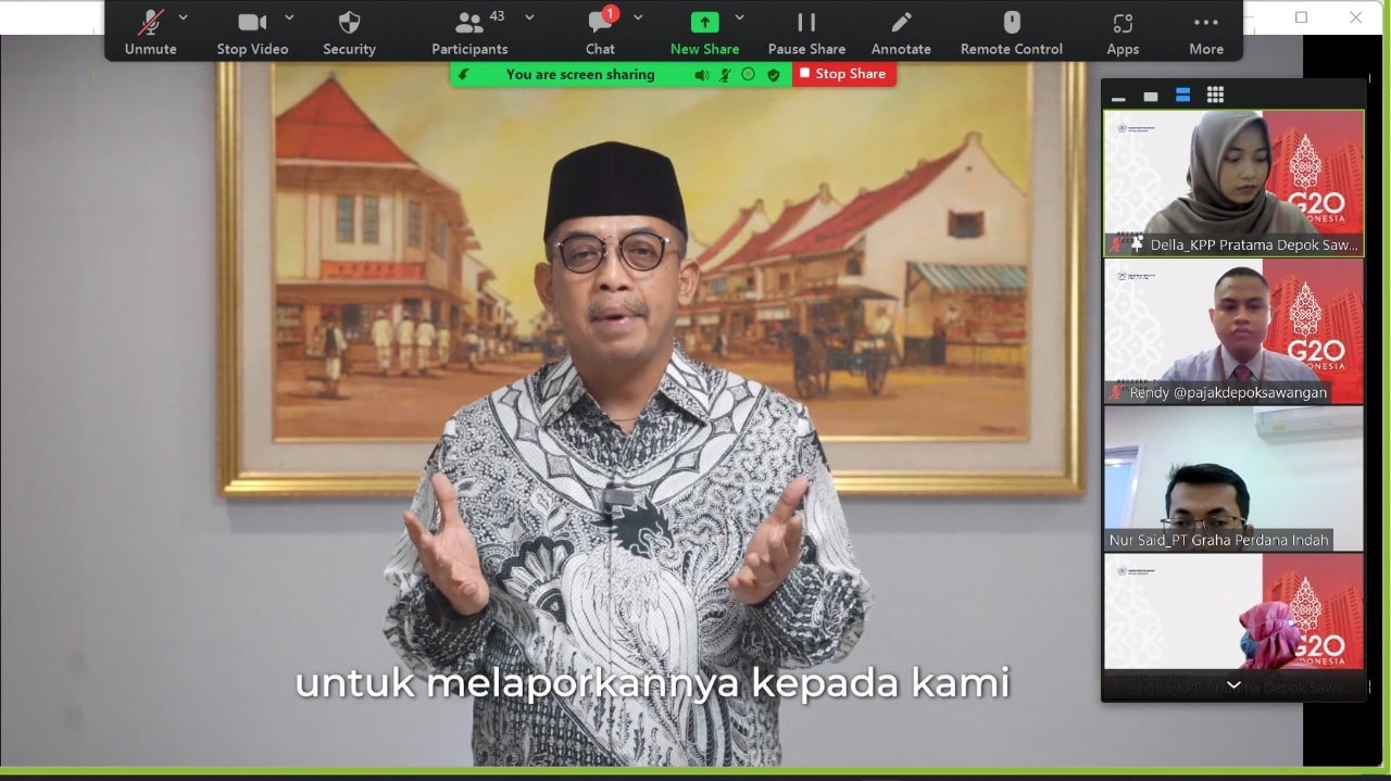 "Salam Reformasi! DJP kuat, Indonesia maju!" seru Direktur Jenderal Pajak Suryo Utomo dalam video pesan reformasi perpajakan yang diputar pada kegiatan edukasi perpajakan bertajuk Kelas Pajak Online dengan tema "PPN = Uang Titipan?", yang digelar Kantor Pelayanan Pajak (KPP) Pratama Depok Sawangan, Depok (Kamis, 21/7).