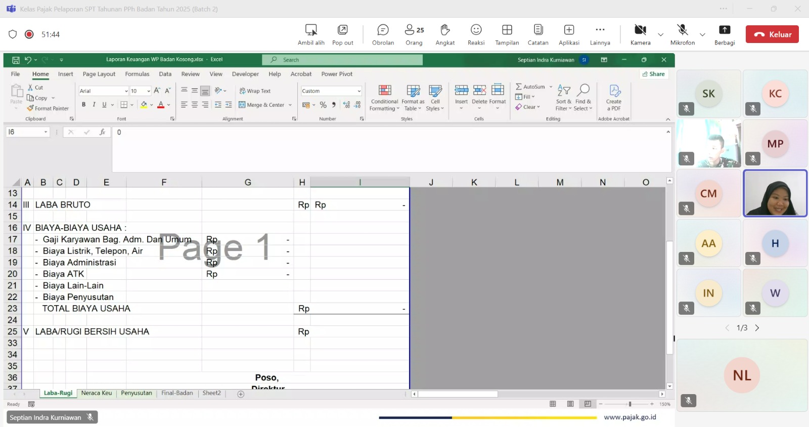 Setelah menjelaskan masing-masing pos pada laporan keuangan, Afni menutup sesi kelas pajak dengan praktik langsung pelaporan SPT Badan. Peserta dipandu login di djponline.pajak.go.id, mengunduh e-Form 1771, kemudian mengisi SPT, dan dilanjutkan melaporkan SPT-nya.