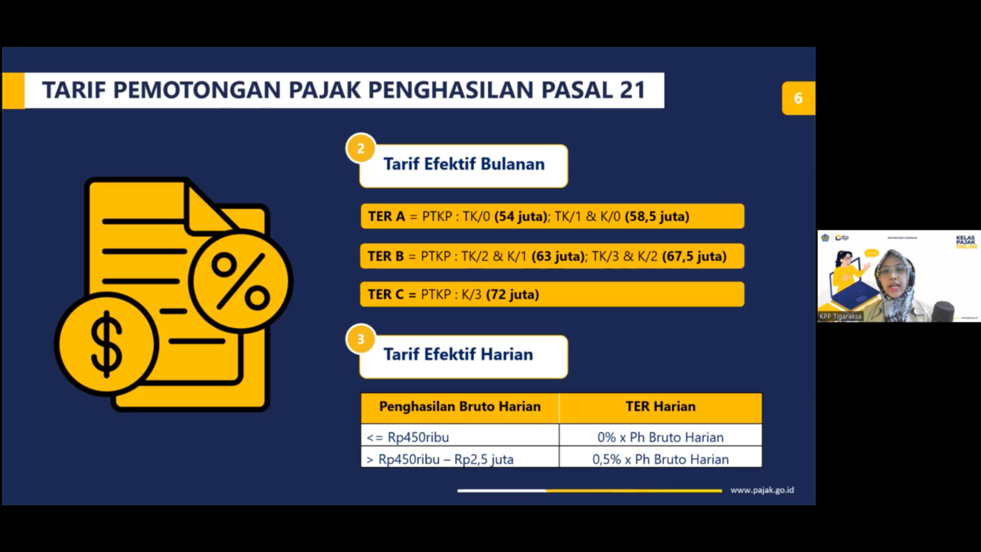 Kantor Pelayanan Pajak (KPP) Tigaraksa menyelenggarakan Kelas Pajak mengenai tata cara penghitungan Pajak Penghasilan (PPh) Pasal 21 dengan mekanisme Tarif Efektif Rata-Rata (TER) dan pelaporan Surat Pemberitahuan (SPT) Masa e-Bupot PPh 21 sesuai dengan Peraturan Menteri Keuangan Nomor 168 Tahun 2023 tentang Petunjuk Pelaksanaan Pemotongan Pajak atas Penghasilan sehubungan dengan Pekerjaan, Jasa, atau Kegiatan Pribadi. Kelas Pajak ini diselenggarakan secara daring di aplikasi Zoom KPP Pratama Tigaraksa (Senin, 29/1).