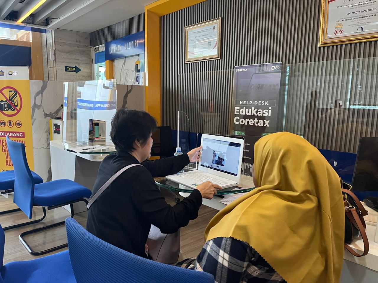 Hayatun, Petugas Helpdesk Kantor Pelayanan Pajak (KPP) Madya Tangerang, memberikan asistensi aktivasi akun Coretax DJP kepada Wajib Pajak Orang Pribadi yang datang ke Loket TPT KPP Madya Tangerang, Kota Tangerang (Rabu, 5/2).