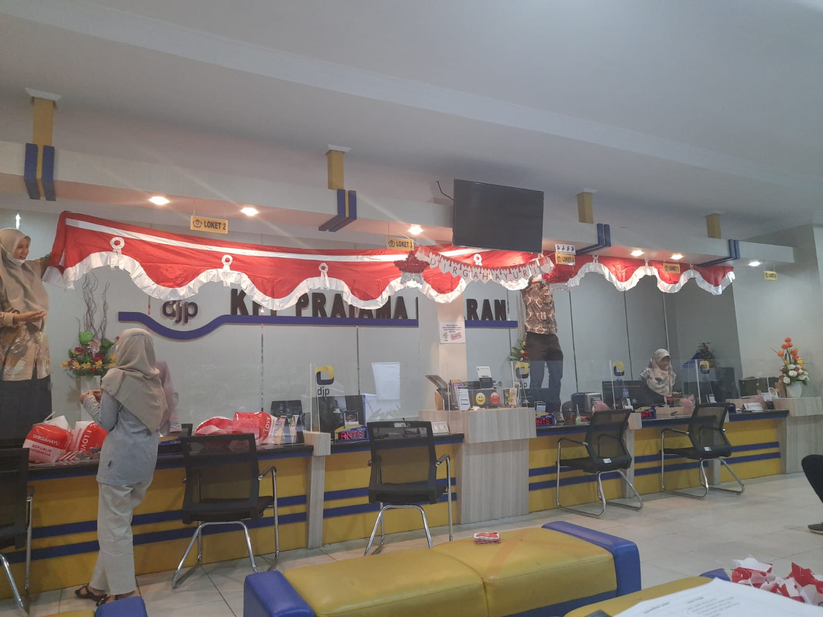 Kantor Pelayanan Pajak (KPP) Pratama Kisaran menghias ruangan Tempat Pelayanan Terpadu (TPT) dengan tema hari kemerdekaan di KPP Pratama Kisaran, Kabupaten Asahan, Sumatera Utara (Jumat, 13/8). Kegiatan menghias TPT ini dilakukan oleh pegawai KPP Pratama Kisaran.