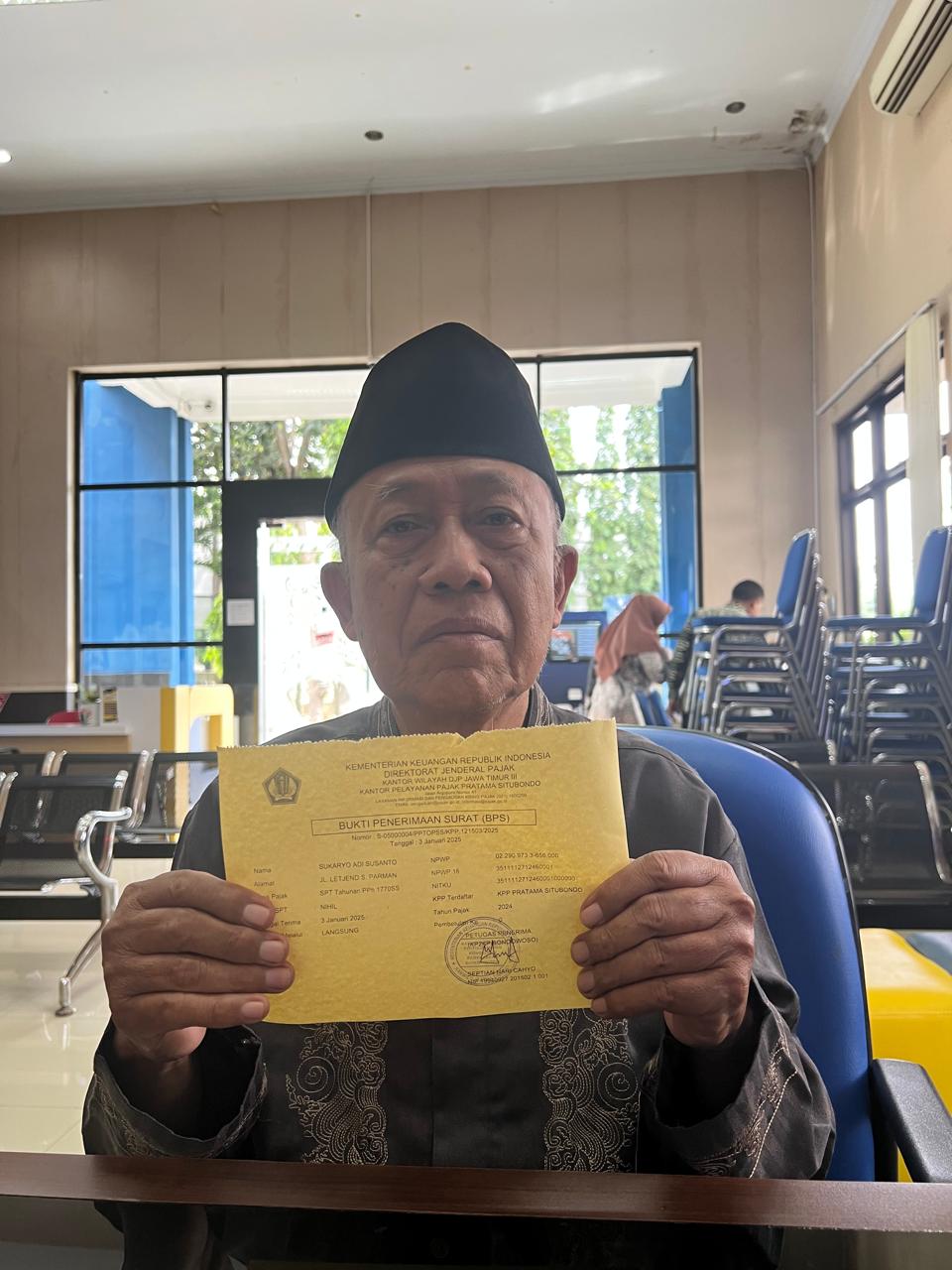 Seorang lansia pensiunan pegawai perkebunan berusia 79 tahun, Sukaryo Adi Susanto, menjadi orang pertama yang mendapat layanan asistensi pelaporan Surat Pemberitahuan (SPT) Tahunan Orang Pribadi di loket Tempat Pelayanan Terpadu (TPT) Kantor Pelayanan, Penyuluhan, dan Konsultasi Perpajakan (KP2KP) Bondowoso, Kabupaten Bondowoso, Jawa Timur (Kamis, 2/1).