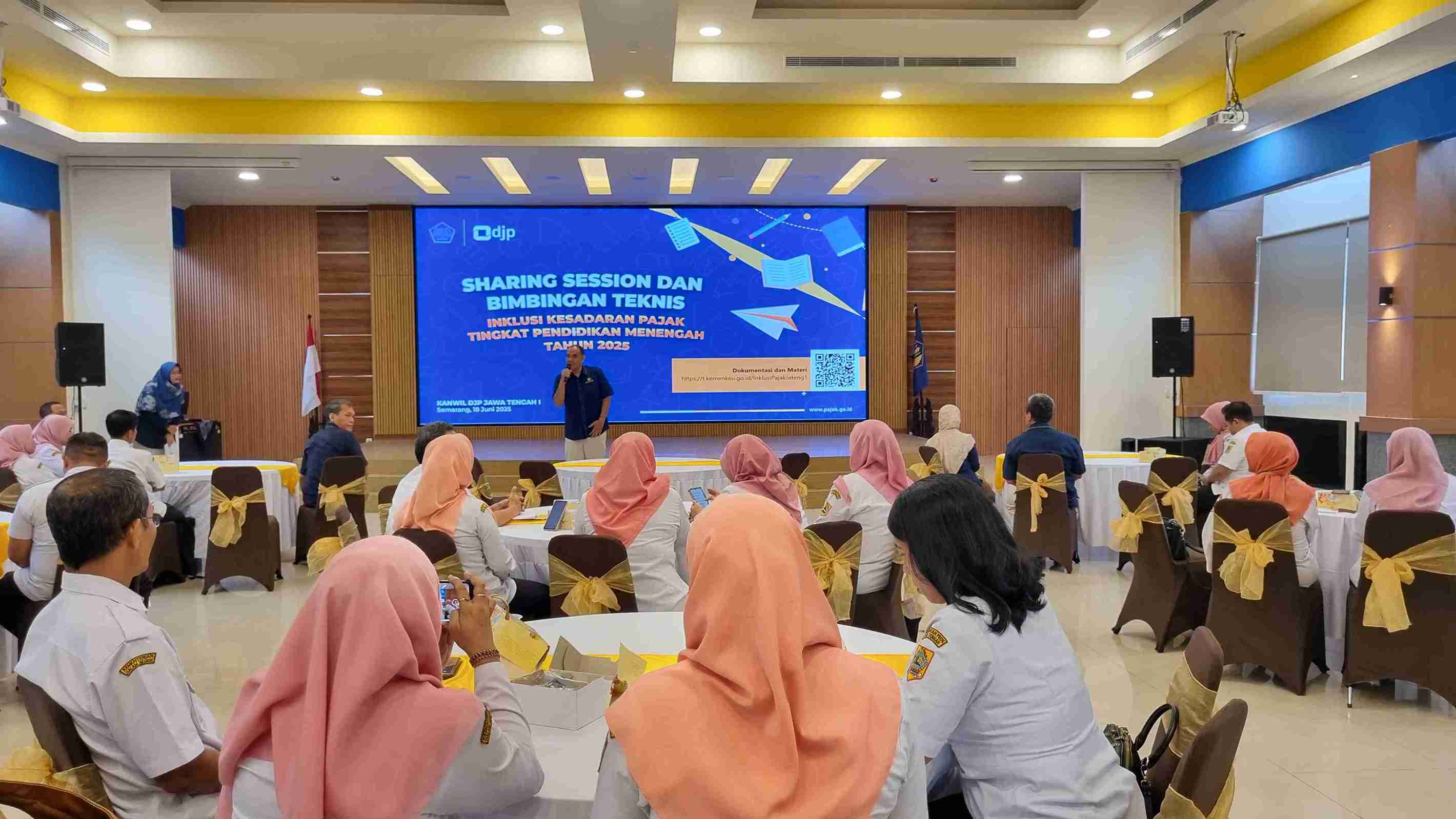 Kantor Wilayah Direktorat Jenderal Pajak (Kanwil DJP) Jawa Tengah I melalui Bidang P2Humas menyelenggarakan kegiatan Sharing Session dan Bimbingan Teknis (Bimtek) Inklusi Kesadaran Pajak pada tingkat pendidikan menengah. Acara yang berlangsung di Aula GKN II, Jalan Imam Bonjol, Kota Semarang (Rabu, 18/6) ini dihadiri oleh perwakilan dari 21 sekolah tingkat SMA dan SMK se-Provinsi Jawa Tengah.
