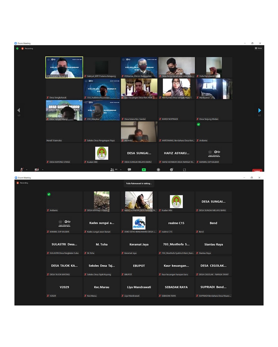 Kegiatan dilaksanakan secara daring menggunakan media Zoom Meeting di ruang rapat KPP Pratama Ketapang, Ketapang (Senin, 27/9). Peserta yang hadir mencapai 90 orang yang merupakan perwakilan Bendahara dari seluruh Instansi Vertikal dan Satuan Kerja Perangkat Daerah dan Desa.