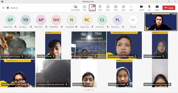 Acara diselingi dengan diskusi dan tanya jawab baik secara langsung maupun melalui kolom chat Microsoft Teams . Kegiatan ini dilaksanakan sebagai upaya Kanwil DJP Banten agar relawan pajak lebih mumpuni dalam menjalani perannya dalam memberikan pelayanan perpajakan kepada wajib pajak.