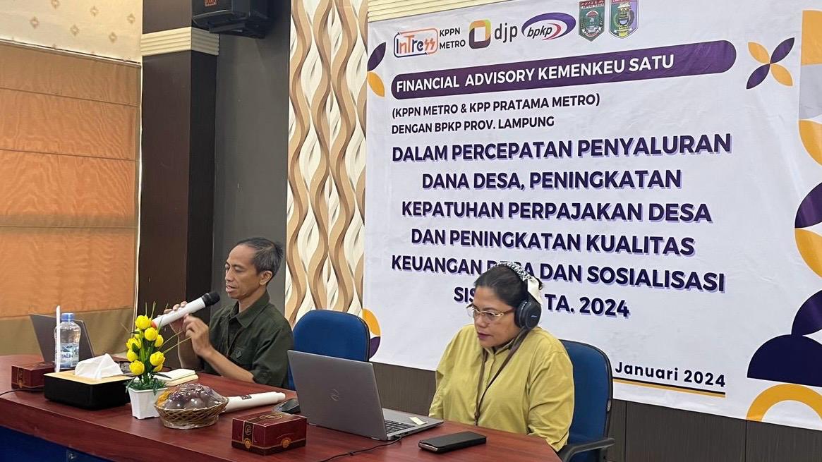 Kantor Pelayanan Pajak (KPP) Metro dan Kantor Pelayanan Perbendaharaan Negara (KPPN) Metro bersama dengan Badan Pengawasan Keuangan dan Pembangunan (BPKP) Provinsi Lampung menggelar acara Bimbingan Teknis terkait Kepatuhan Perpajakan atas Penggunaan dan Alokasi Dana Desa kepada seluruh Kepala Desa di wilayah Kabupaten Lampung Tengah dan Lampung Timur yang bertempat di Aula KPPN Metro, Jalan Seminung Nomor 5, Imopuro, Kecamatan Metro Pusat, Kota Metro, Lampung (Kamis, 25/1). Kegiatan ini dilaksanakan dalam rangka Financial Advisory Kementerian Keuangan (Kemenkeu) Satu.