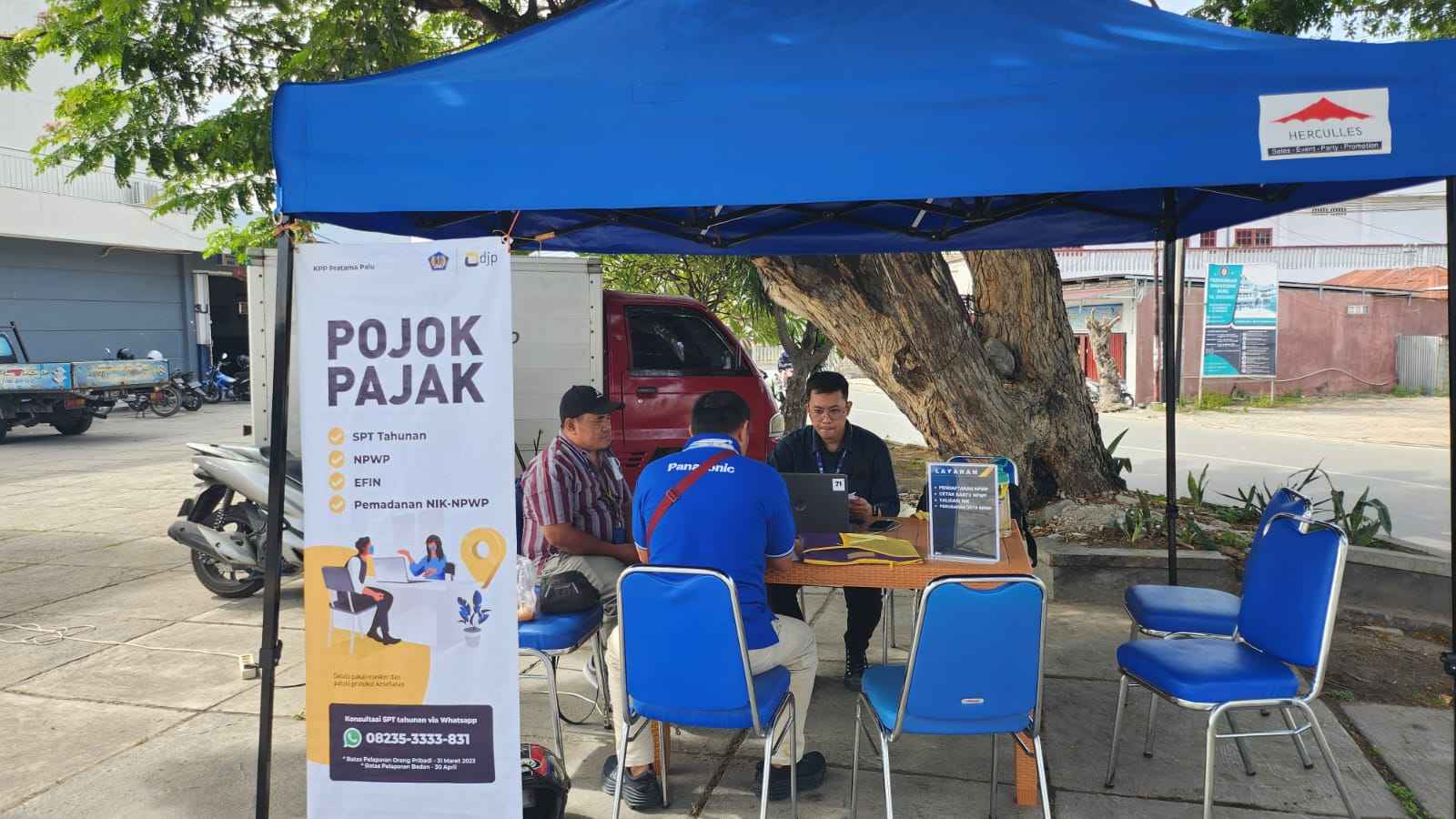 Kantor Pelayanan Pajak (KPP) Pratama Palu mengadakan kegiatan pojok pajak di Sinar Galesong Mandiri, Kota Palu, Sulawesi Tengah (Senin, 27/2). Kegiatan yang berlangsung hingga 3 Maret 2023 ini bertujuan untuk memberikan kemudahan kepada wajib pajak dalam mendapatkan pelayanan asistensi pelaporan Surat Pemberitahuan (SPT) Tahunan dan pemadanan Nomor Induk Kependudukan (NIK) menjadi Nomor Pokok Wajib Pajak (NPWP).