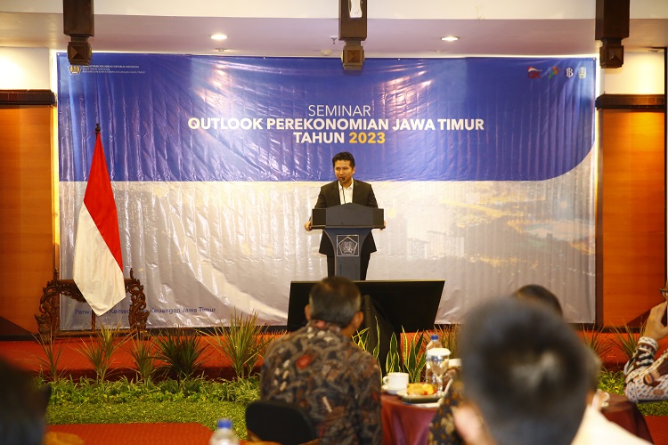 Perwakilan Kementerian Keuangan Jawa Timur dan Pemerintah Daerah Provinsi Jawa Timur menyelenggarakan Seminar Outlook Perekonomian Jawa Timur Tahun 2023 secara hybrid dari Aula Lantai 8 Kantor Wilayah DJP Jawa Timur I di Surabaya (Senin, 19/12).
