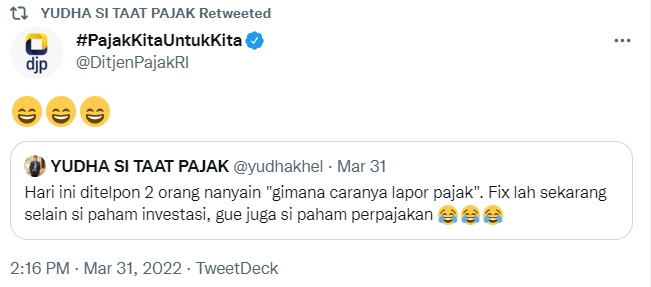 Hingga 14 April 2022, akun Twitter Yudha masih belum berganti, ia masih menggunakan nama 'Yudha Si Taat Pajak' dalam profil. Tanggal 17 Maret 2022 lalu, Yudha juga memberikan testimoni mengenai pelaporan SPT. Yudha juga mengajak warganet melaporkan SPT. Video testimoni Yudha turut diunggah dalam akun instagram resmi KPP Pratama Depok Cimanggis (@pajakdepokcmg).