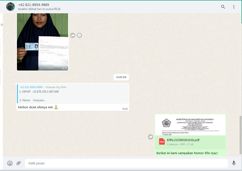 Untuk mengetahui kebenaran identitas wajib pajak dalam pengajuan permohonan EFIN via Whatsapp, wajib pajak harus mengirimkan foto Nomor Pokok Wajib Pajak (NPWP), foto Kartu Tanda Penduduk (KTP), alamat surel, nomor handphone, serta swafoto diri sambil memengang NPWP dan KTP kemudian mengirimkan ke nomor layanan Whatsapp KP2KP Bontosunggu.