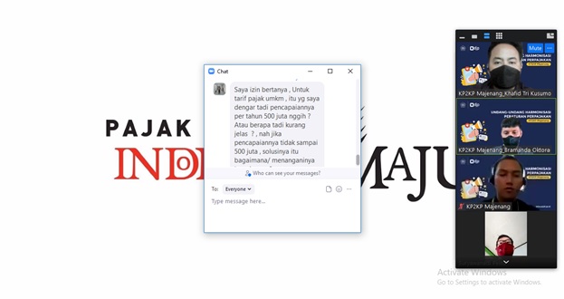 Undang-Undang Nomor 7 Tahun 2021 Tentang Harmonisasi Peraturan Perpajakan, secara garis besar merubah beberapa tarif dan ketentuan perpajakan yang sudah berlaku. Undang-Undang Harmonisasi Peraturan Perpajakan akan mulai efektif berlaku pada tahun 2022. Sosialisasi kali ini diikuti oleh Wajib Pajak Orang Pribadi dan Badan di wilayah kerja KP2KP Majenang melalui media zoom.
