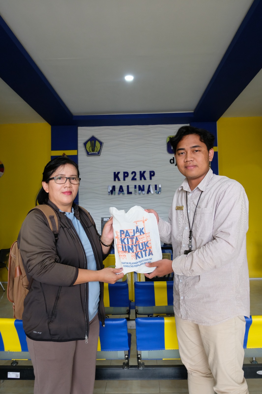 Kantor Pelayanan, Penyuluhan, dan Konsultasi Perpajakan (KP2KP) Malinau memberikan apresiasi kepada pelapor Surat Pemberitahuan (SPT) Tahunan 2023 pertama pada tahun ini yang datang di KP2KP Malinau, Kab. Malinau (Kamis, 4/1). Wajib pajak mendatangi KP2KP Malinau sambil membawa bukti potong dari bendahara Dinas Pendidikan Kab. Malinau.