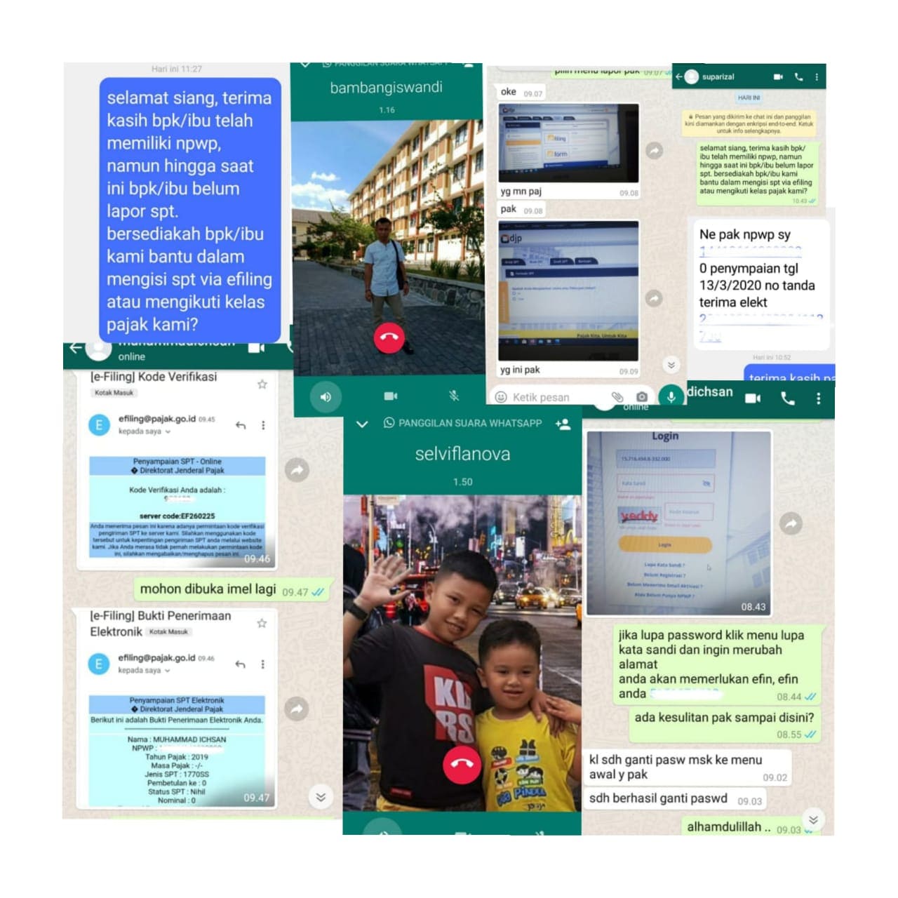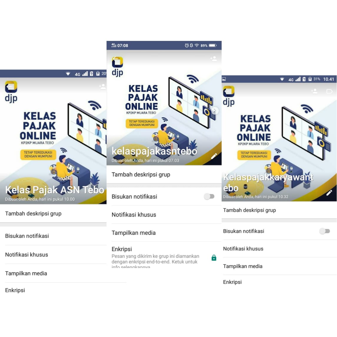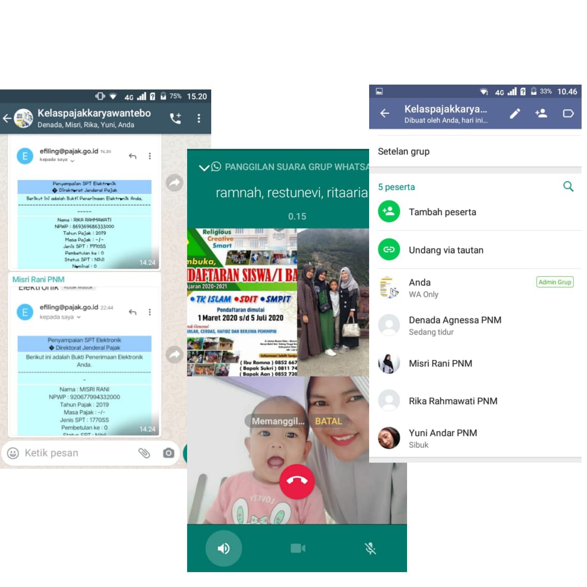 KP2KP Muara Tebo mengadakan penyuluhan berupa kelas pajak melalui grup dan panggilan video WhatsApp terkait penyampaian SPT Tahunan secara daring kepada Wajib Pajak (WP) Orang Pribadi Karyawan yang terdaftar di KP2KP Muara Tebo (Jumat, 17/4). Kegiatan ini dilaksanakan sebagai pengganti kegiatan pelayanan dan penyuluhan secara tatap muka yang ditiadakan untuk mencegah penyebaran Covid-19.