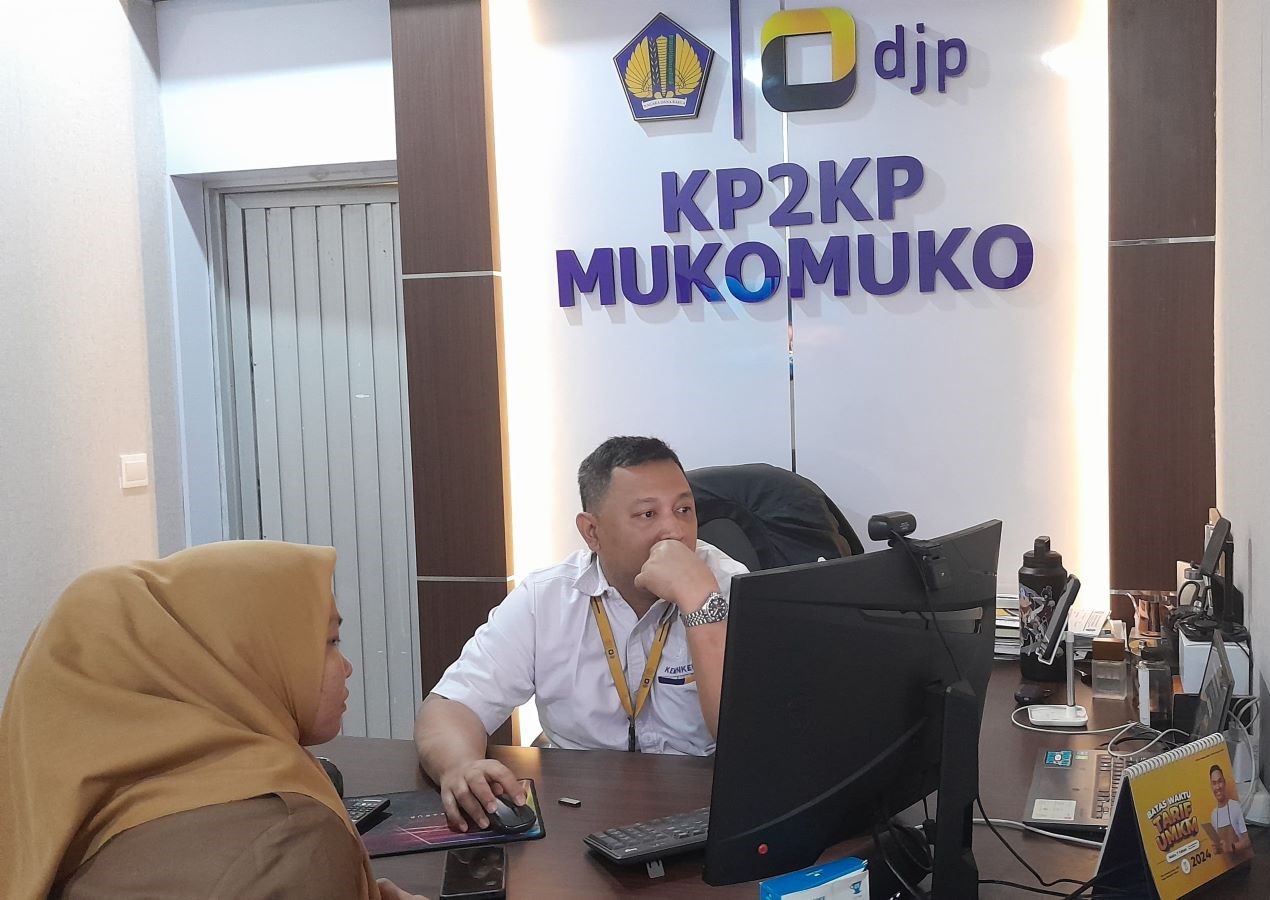 Kepala Kantor Pelayanan, Penyuluhan, dan Konsultasi Perpajakan (KP2KP) Mukomuko, Tomi Wiranto, menerima kunjungan dari Bendahara Gaji Badan Keuangan Daerah (BKD) Kabupaten Mukomuko, Ayu Dea, di Ruang Kepala KP2KP Mukomuko di Jalan Padang-Bengkulu, Kelurahan Bandar Ratu, Kecamatan Kota Mukomuko, Kabupaten Mukomuko (Senin, 10/2).