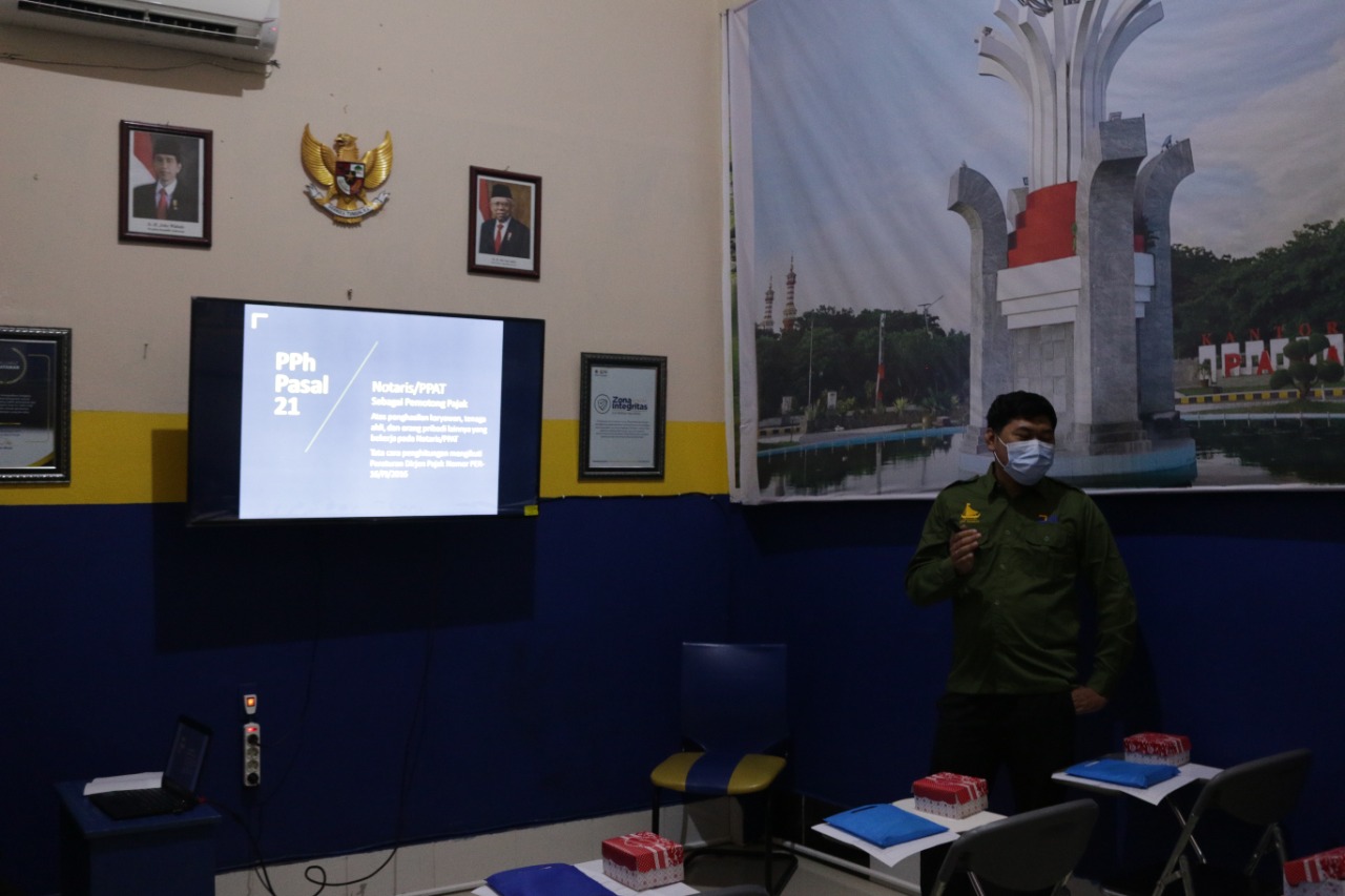 Kantor Pelayanan, Penyuluhan, dan Konsultasi Perpajakan (KP2KP) Pasangkayu mengadakan kegiatan edukasi kewajiban perpajakan bagi notaris dan PPAT (Kamis, 3/2). Kegiatan ini dihadiri oleh perwakilan dari notaris dan PPAT yang tersebar di wilayah Kabupaten Pasangkayu dan dilaksanakan secara tatap muka di ruang kelas pajak KP2KP Pasangkayu dengan tetap memperhatikan protokol kesehatan.