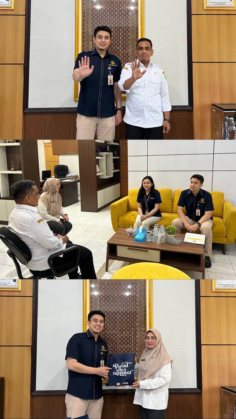 Kepala Kantor Pelayanan, Penyuluhan, dan Konsultasi Perpajakan (KP2KP) Sambas, Rocky Pratama Ardiwinata, bersama salah satu pelaksana Kantor Pelayanan, Penyuluhan, dan Konsultasi Perpajakan (KP2KP) Sambas, Vania Sianipar, mengunjungi Badan Keuangan Daerah (Bakeuda) Kabupaten Sambas yang beralamat di Jalan Pembangunan, Kecamatan Sambas, Kabupaten Sambas, Kalimantan Barat (Rabu, 23/7).