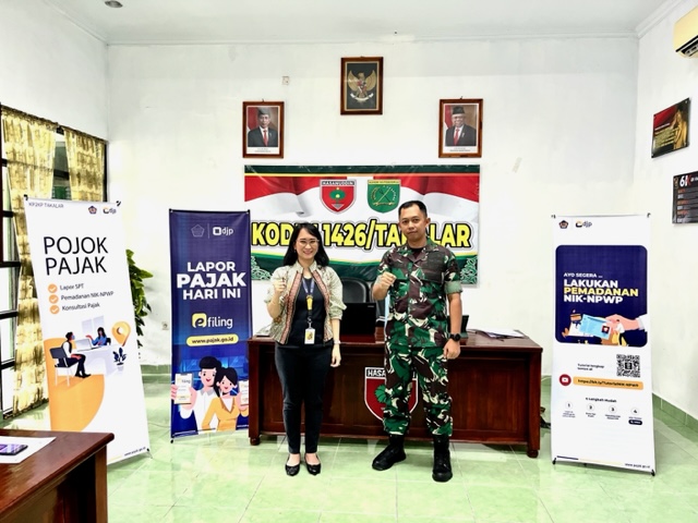 Kantor Pelayanan, Penyuluhan, dan Konsultasi Perpajakan (KP2KP) Takalar mengadakan Pojok Pajak Pelaporan Surat Pemberitahuan (SPT) Tahunan Wajib Pajak Orang Pribadi melalui e-Filing dan pemadanan Nomor Induk Kependudukan (NIK) sebagai Nomor Pokok Wajib Pajak (NPWP) secara online di Kodim 1426 Kabupaten Takalar (Selasa, 24/1).