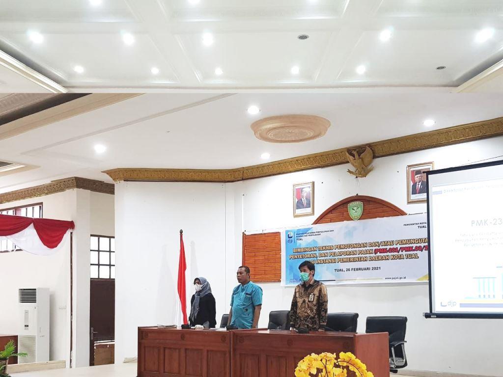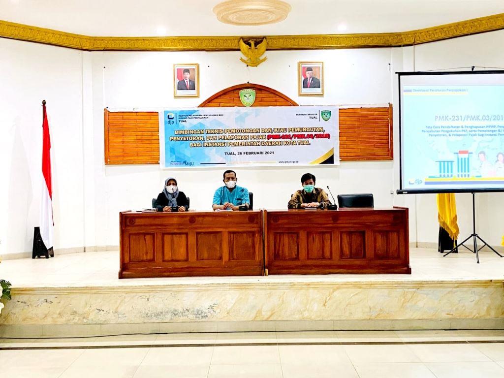 Kantor Pelayanan, Penyuluhan, dan Konsultasi Perpajakan (KP2KP) Tual mengadakan Bimbingan Teknis Pemotongan dan/atau Pemungutan, Penyetoran dan Pelaporan Pajak bagi Instansi Pemerintah Kota Tual di Aula Kantor Walikota Tual, Kabupaten Maluku Tenggara, Maluku (Jumat, 26/2). Kegiatan ini dihadiri 96 peserta dari seluruh Instansi Pemerintah Daerah di Kota Tual
