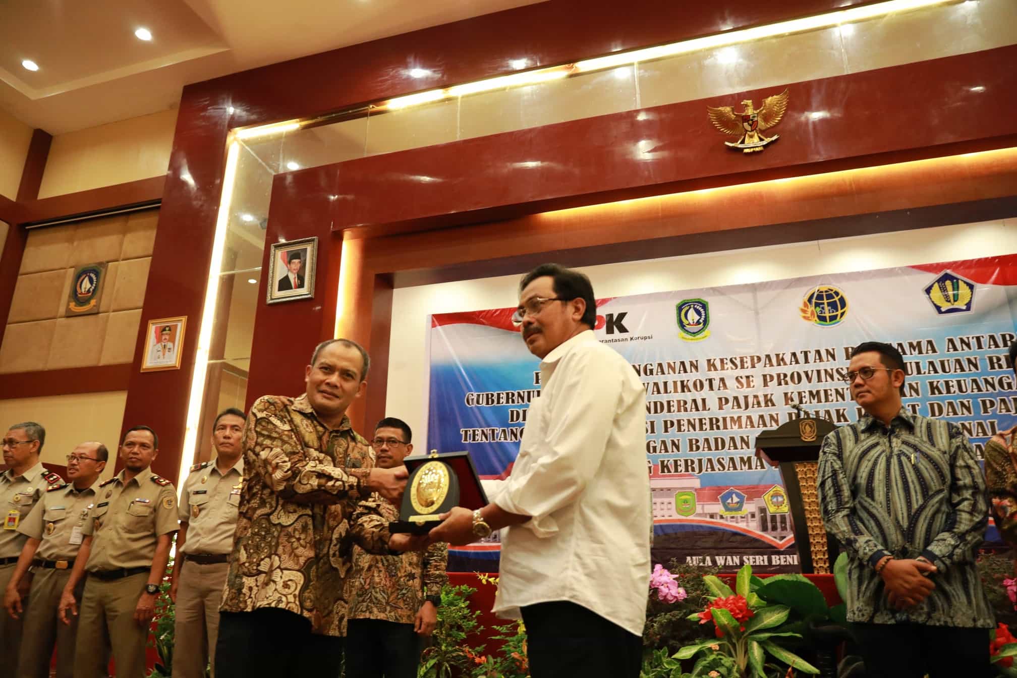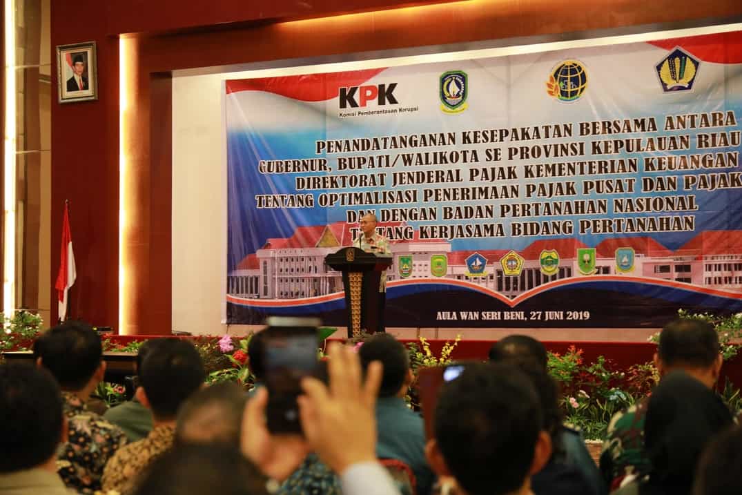 Pemerintah se-Provinsi Kepulauan Riau tandatangani Kesepakatan Bersama dengan Kantor Wilayah DJP Kepulauan Riau terkait Koordinasi dalam Upaya Optimalisasi Penerimaan Pajak Pusat, Pajak Daerah, dan Retribusi Daerah dengan disaksikan langsung oleh Ketua KPK, Agus Rahardjo dan Direktur Kitsda, Harry Gumelar di Aula Wan Seri Beni Gedung Istana Kota Piring, Pusat Pemerintahan Provinsi Kepulauan Riau, Kota Tanjungpinang pada hari ini (Senin, 27/06).