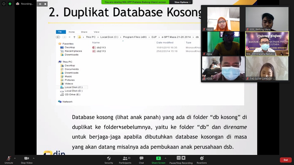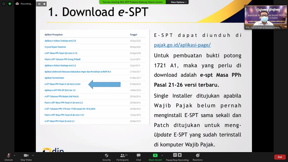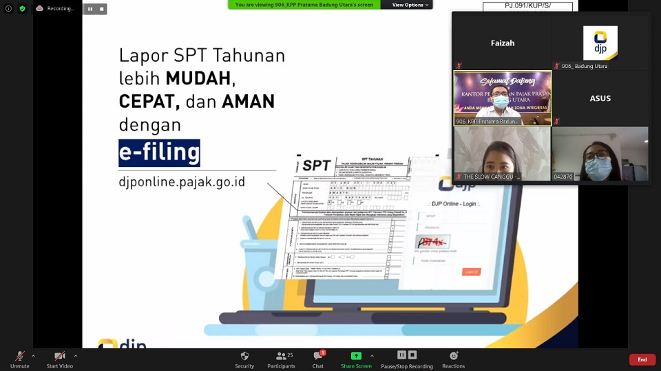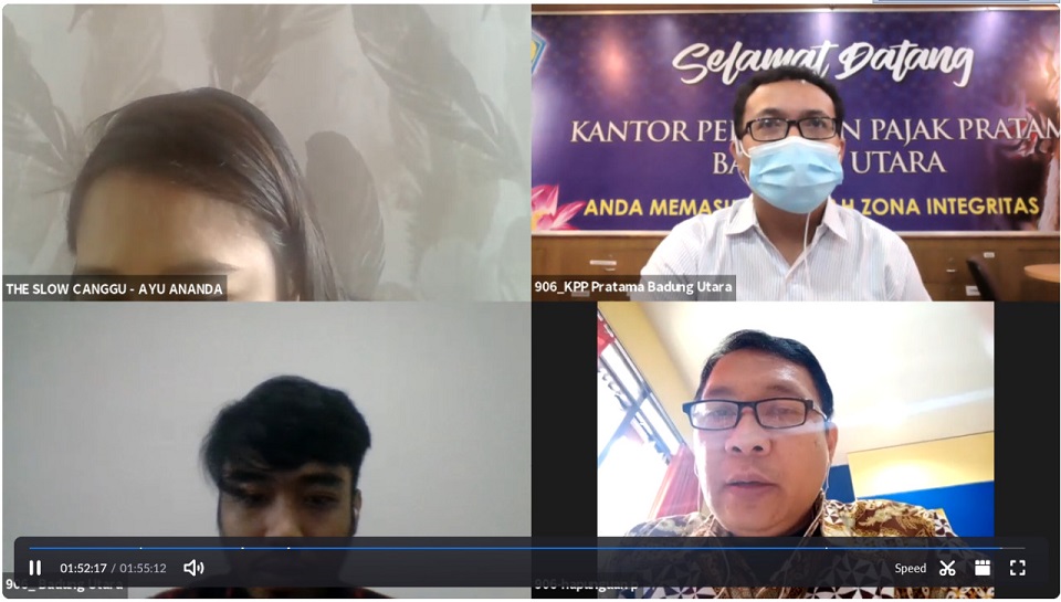 Kantor Pelayanan, Penyuluhan, dan Konsultasi Perpajakan (KP2KP) Kerobokan dan Kantor Pelayanan Pajak Pratama (KPP) Badung Utara menggelar Webinar bertema “Penerbitan Bukti Potong 1721 dan Pelaporan Pajak Secara e-Filing” di Denpasar, Bali (Kamis, 29/1). Sosialisasi ini diikuti lebih dari dua puluh wajib pajak pemberi kerja di wilayah Kabupaten Badung yang dilaksanakan secara daring melalui Zoom Meeting.