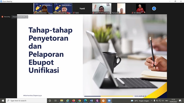 Kantor Pelayanan Pajak (KPP) Pratama Bintan menyelenggarakan bimbingan teknis (bimtek) penggunaan Aplikasi e-Bupot Unifikasi secara daring di Bintan, Kepulauan Riau (Kamis, 14/4). Bimtek ini ditujukan kepada Wajib Pajak Badan Usaha yang berminat untuk belajar aplikasi e-Bupot. Acara yang dimulai pada pukul 10.00 WIB ini berlangsung sekitar 2 jam dengan narasumber Penyuluh Pajak Meiradi. Kegiatan yang diselenggarakan secara daring ini berlangsung interaktif dengan pemaparan materi, diskusi, dan tanya jawab.