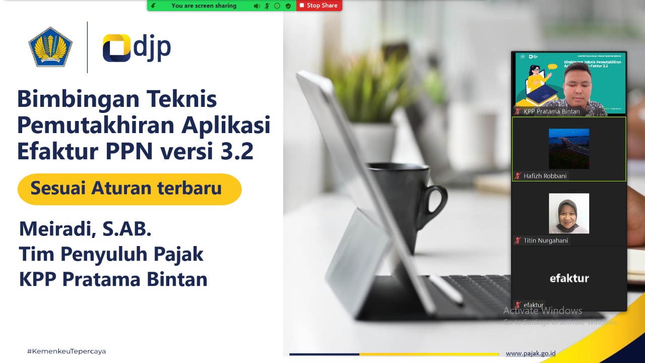 Kantor Pelayanan Pajak Pratama (KPP) Bintan kembali mengadakan bimbingan teknis (bimtek) secara daring dengan tema "Bimbingan Teknis Pemutakhiran Aplikasi ePPN e-Faktur 3.2" yang dibuka untuk umum di Bintan, Kepulauan Riau (Selasa, 19/4). Bimtek yang dilaksanakan mulai pukul 10.00 WIB ini dipandu oleh Petugas Penyuluh KPP Bintan Meiradi sebagai pemateri.